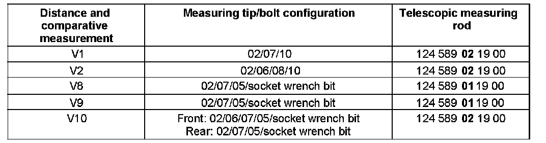 The configuration of the measuring bolts is shown in the table, where the numbers in the column headed "Measuring tip/bolt configuration" are the special tool end numbers.