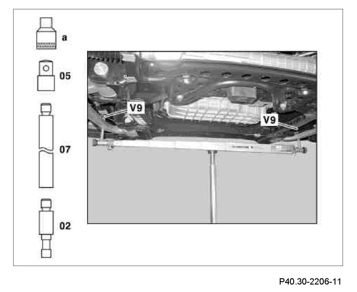 4 Measure distance dimension (V9) from the centering point of the Torx bolt heads between the front bearings of the front axle carrier.