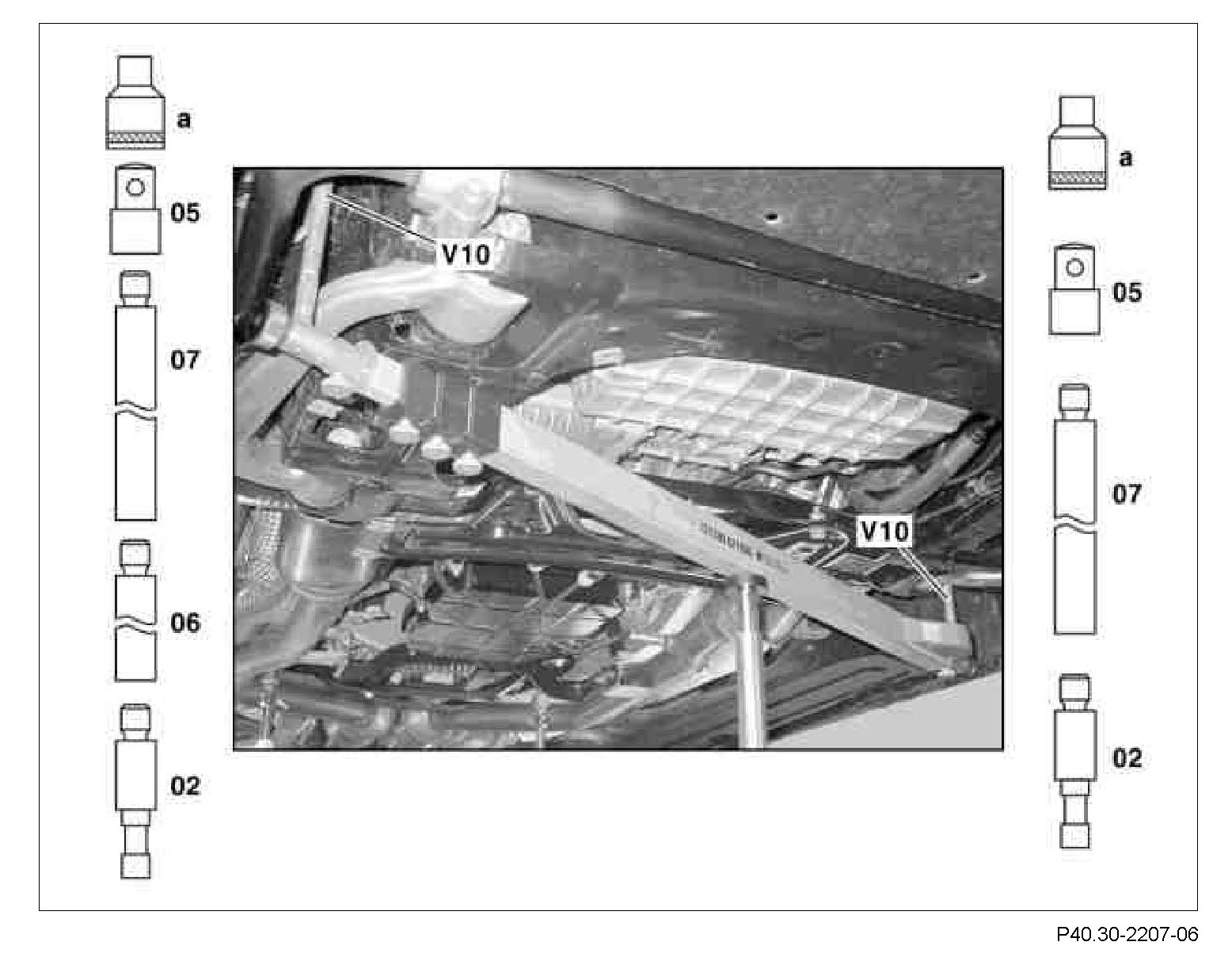 5 Measure distance dimension (V10) diagonally from the centering point of the Torx bolt heads between the front and rear mount of the front axle carrier, left to right.