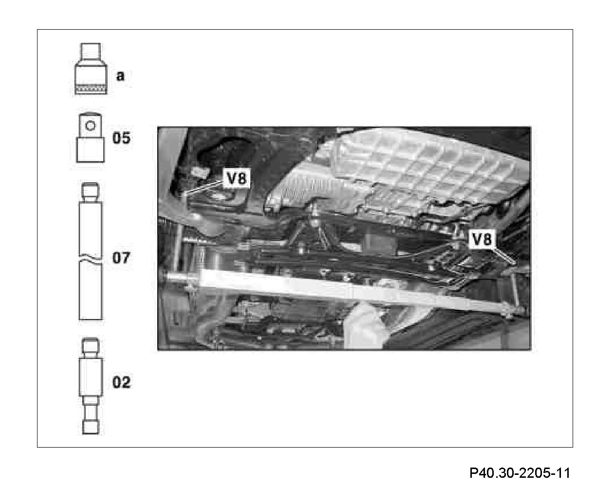 3 Measure distance dimension (V8) from the centering point of the Torx bolt heads between the rear bearings of the front axle carrier.