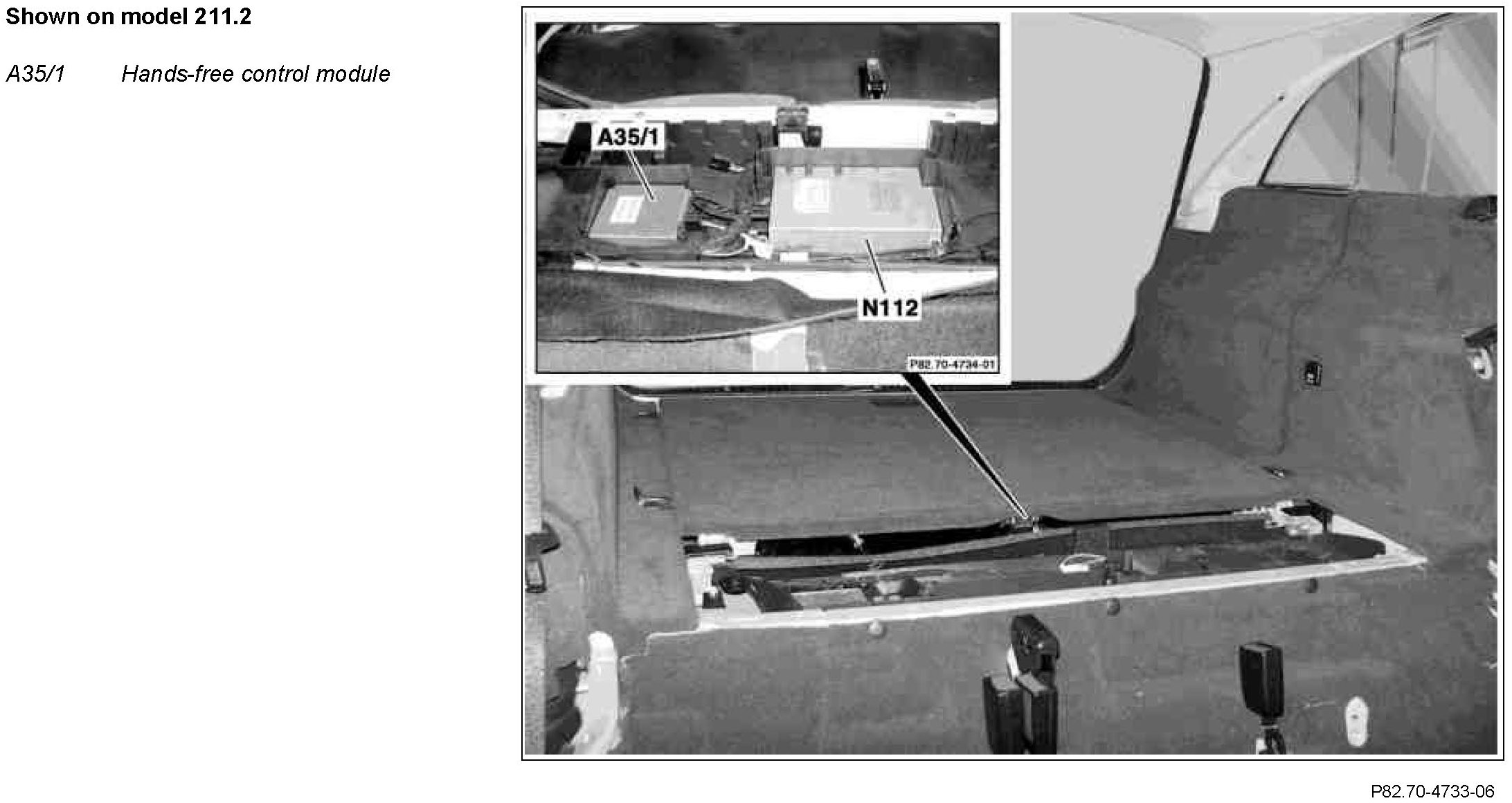 The hands-free system control module (A35/1) is fitted behind the seat bench on the equipment bridge.