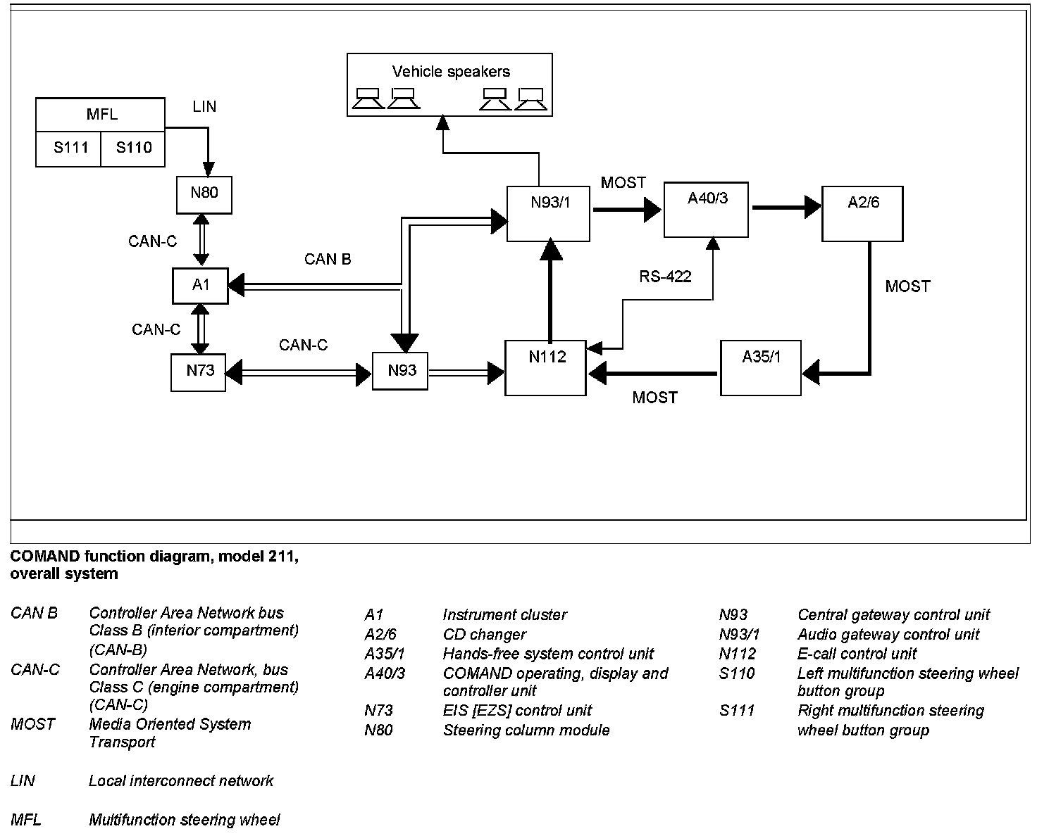Data and signals between the audio gateway control unit (N93/1), the COMAND operating, display and controller unit (A40/3), the CD changer (A2/6), the E-call control unit (N112) and the hands-free system control unit (A35/1) are exchanged via the MOST (Media Oriented System Transport).