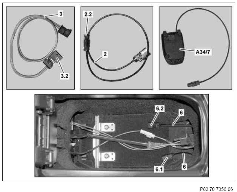 3 Connect black 4-pin connector (3.2) of on-board wiring harness for Bluetooth module (3) to black 4-pin coupling (6.2) of vehicle wiring harness (6) and by doing so connect the cell phone separation point.