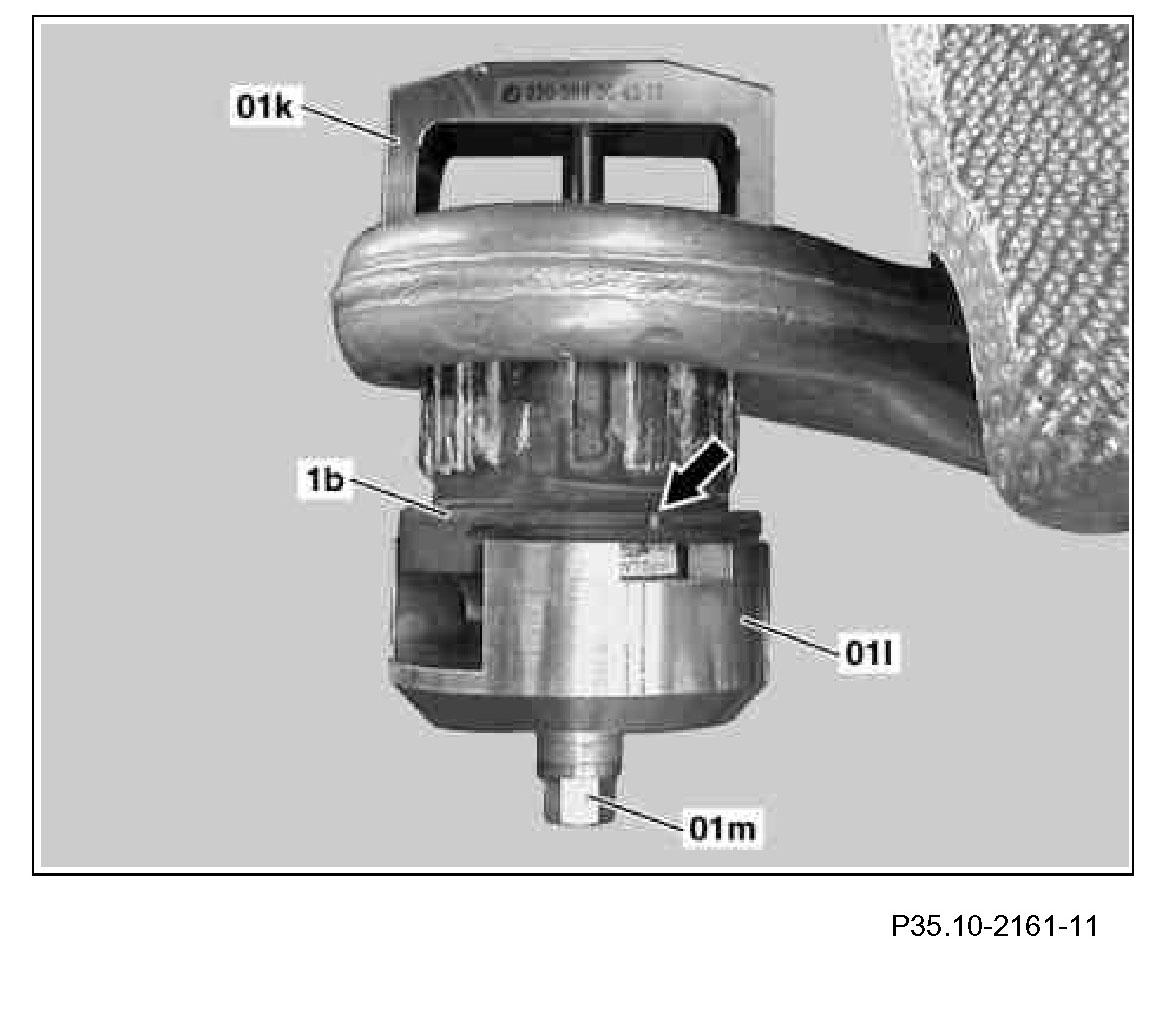 The bumps of the rubber mount (1b) must be seated in the recesses of the thrust piece (01l). Pay attention to installation position. The notch (arrow) of the rubber bushing (1b) must point towards the vehicle rear.