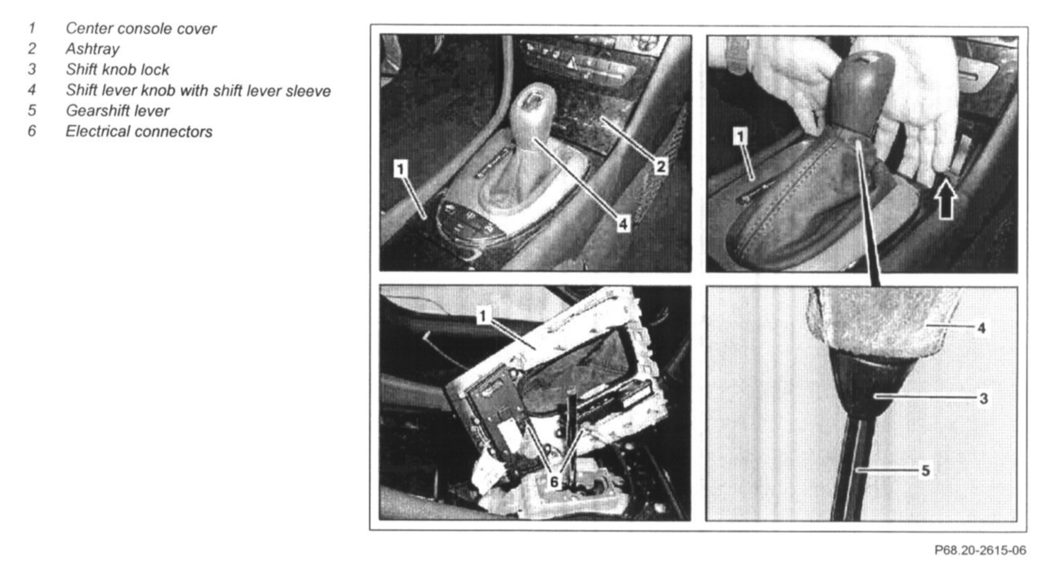7 Press shift lever knob with shift lever sleeve (4) out of the center console cover (1)