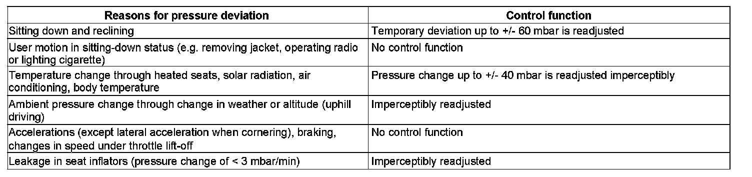 The set specified pressures for the individual cushion areas are regulated by the left front dynamic seat control unit (N32/19) and right front dynamic seat control unit (N32/22) (imperceptible to customer), as long as the functional conditions for manual adjustment have been fulfilled.