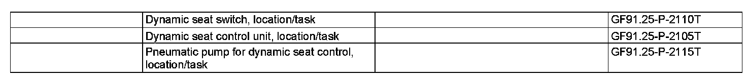 The valves in the driver seat air cushions are actuated by the left front dynamic seat control unit (N32/19) and the valves in the front passenger seat air cushions by the right front dynamic seat control unit (N32/22). The air supply that is necessary to fill the air cushions is provided by the pneumatic pump for dynamic seat control (M40/1).
