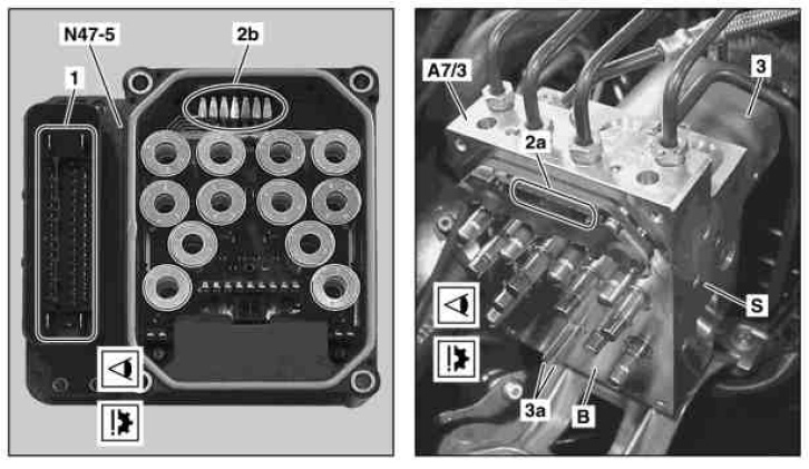 The plug contacts (3a) must be perpendicular to the bottom face (B) and parallel to the side face (S) of the hydraulic unit (A7/3); carefully align the plug contacts (3a) if necessary.