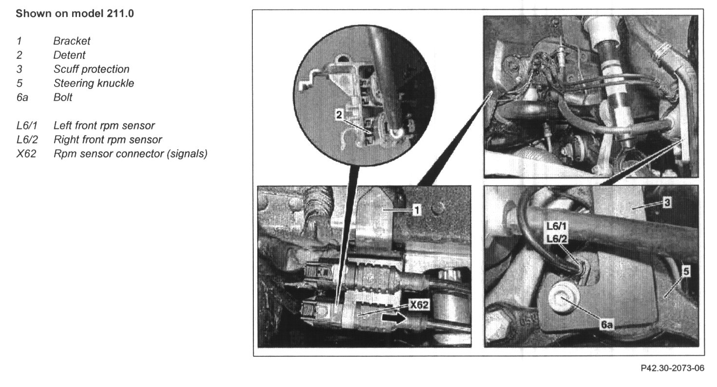 CAUTION: Installation: installation position must be noted. The scuff protection (3) must be bolted to front rpm sensor. It must not be installed between the left or right front rpm sensor (L6/1, L6/2) and the steering knuckle (5) as this may damage the cable.