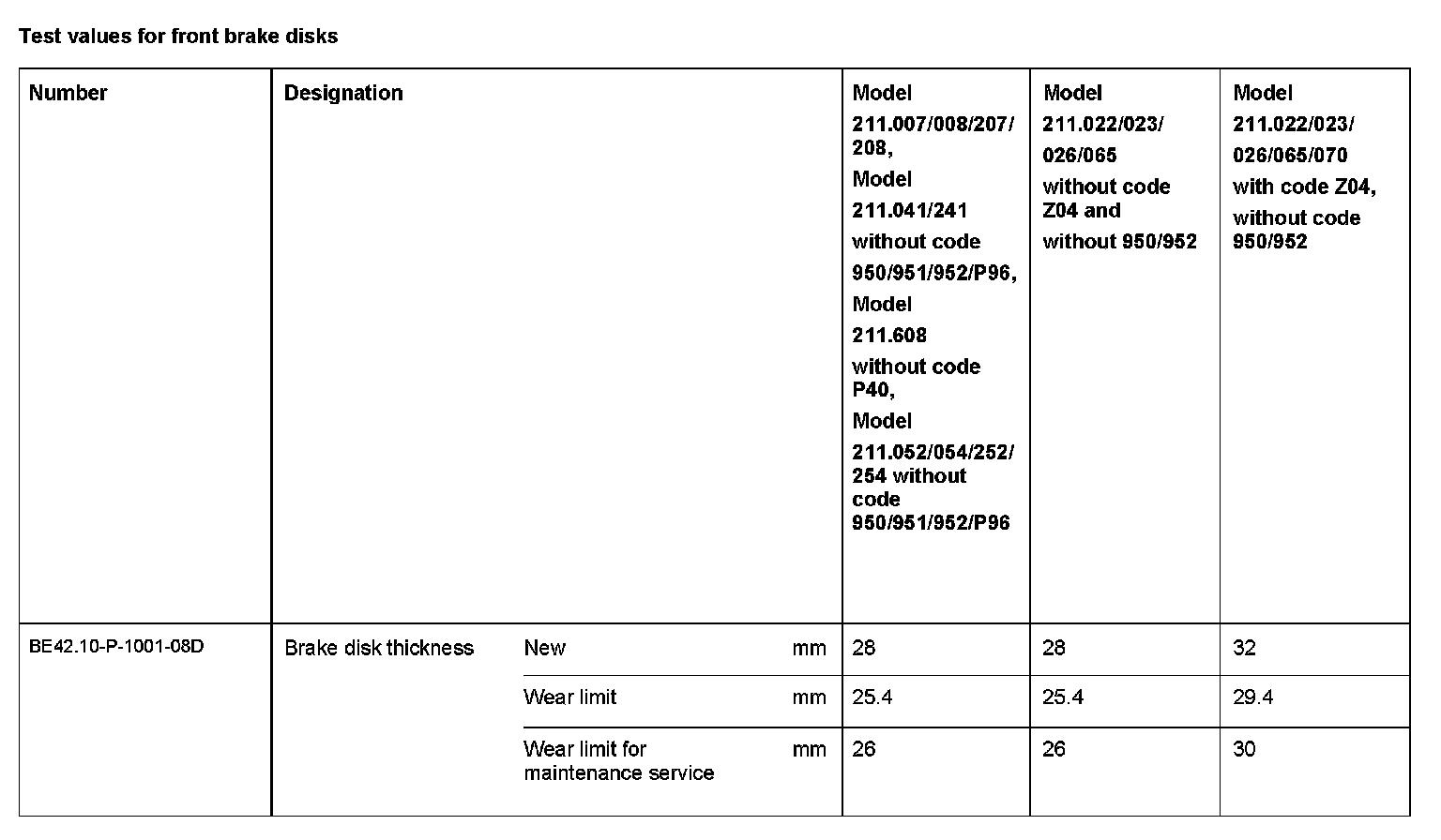 Test Values For Front Brake Disks: