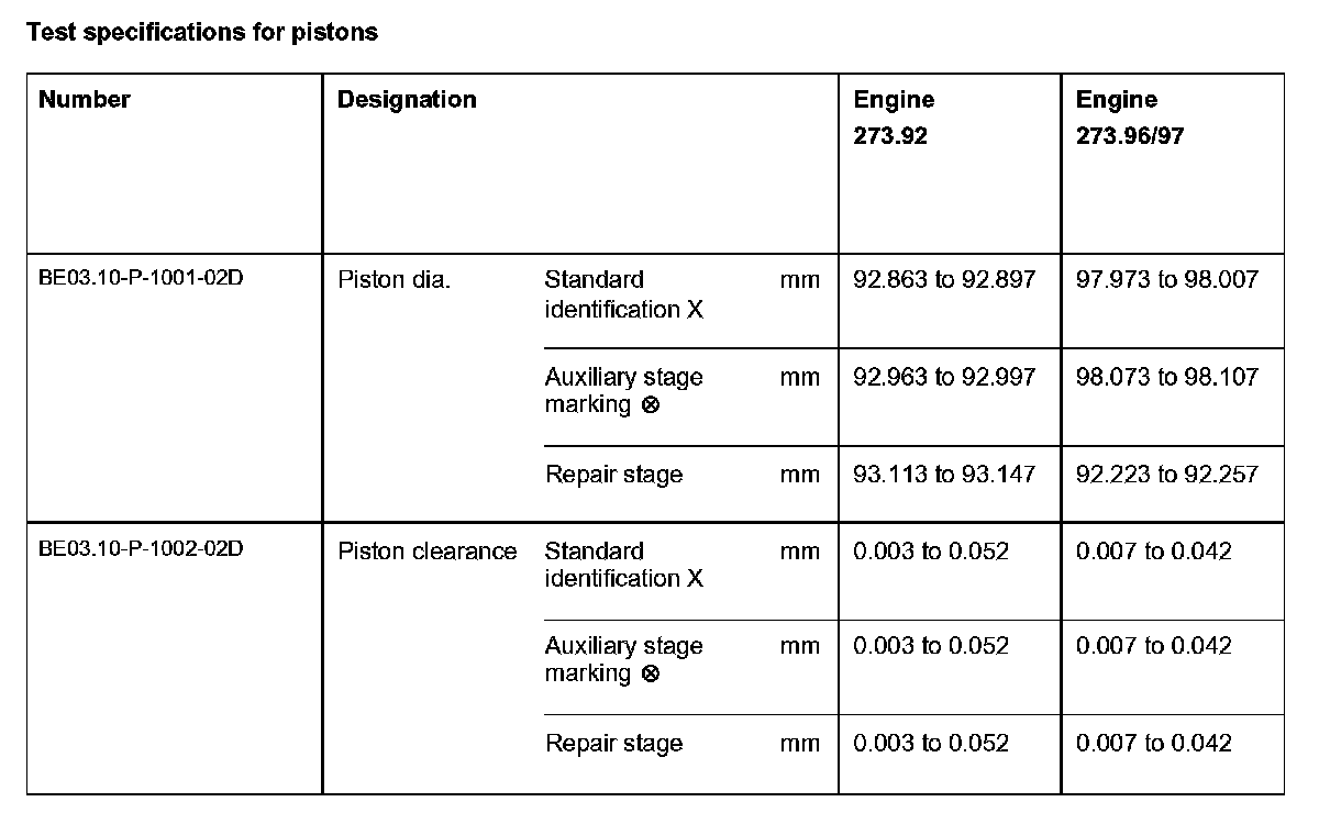 Test specifications for pistons: