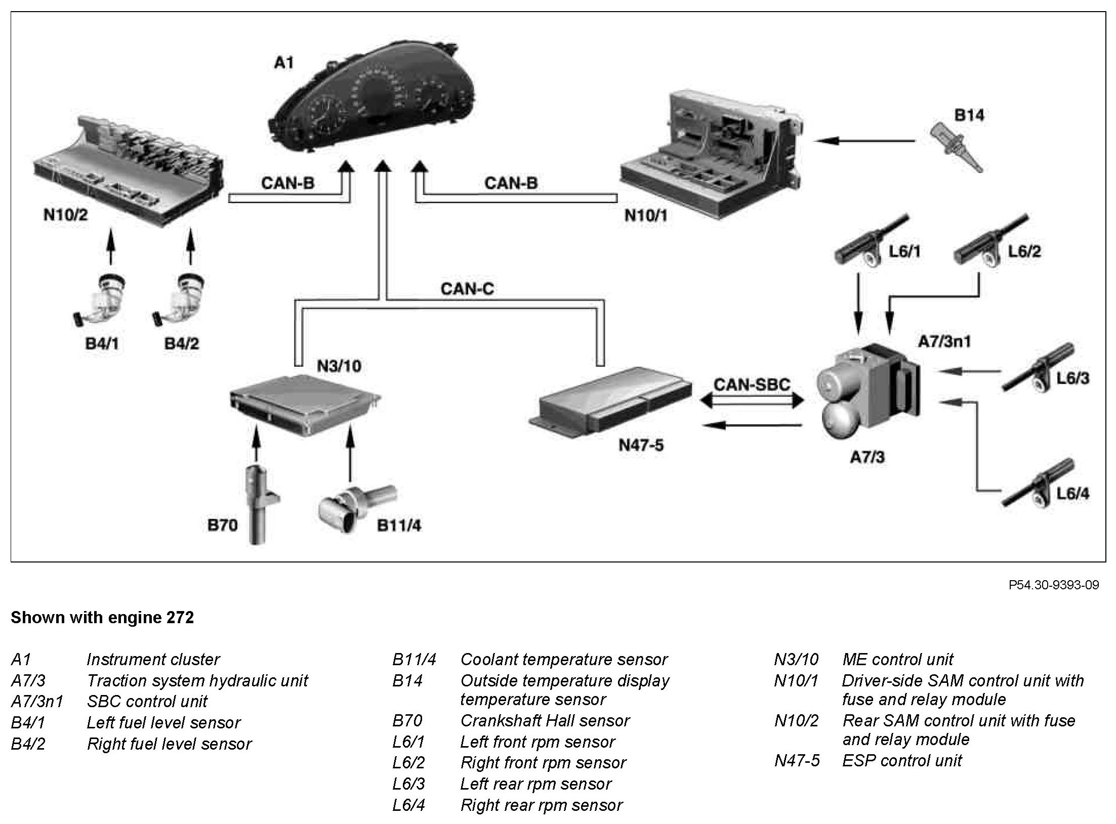 The resistance of the coolant temperature sensor is read in via the ME-SFI [ME] control unit or by the CDI control unit (N3/9) and placed on CAN C. The instrument cluster reads in this value from CAN-C and actuates the coolant temperature display (A1p1) accordingly. A warning message appears in the multifunction display if necessary.