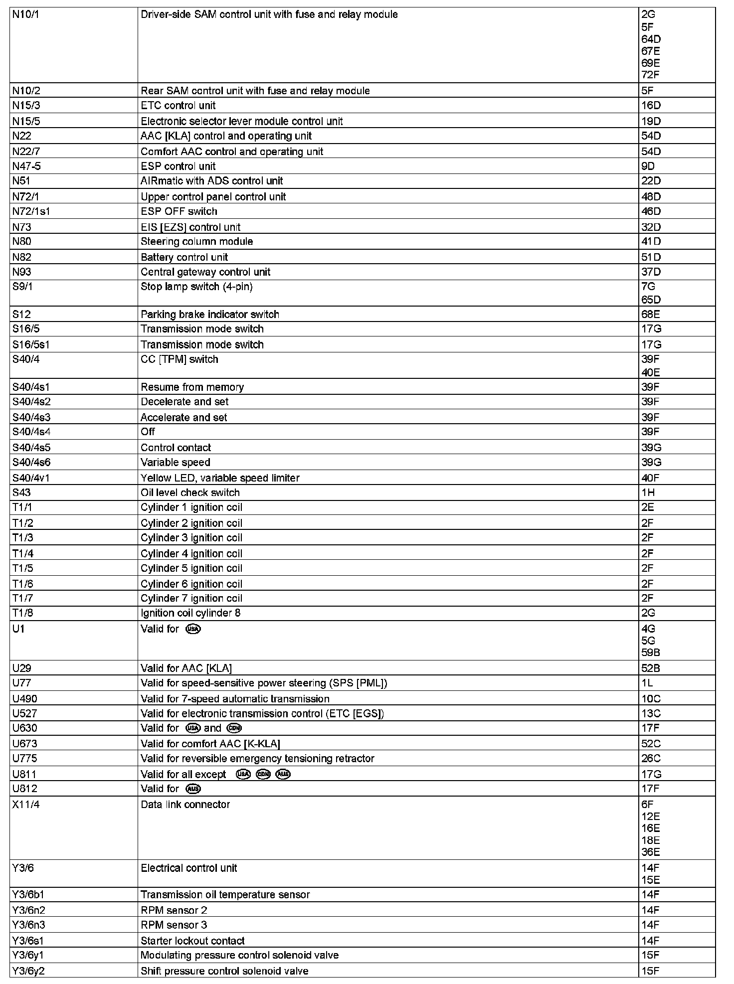 Component Description/Coordinates, N10/1 To Y3/6y2: