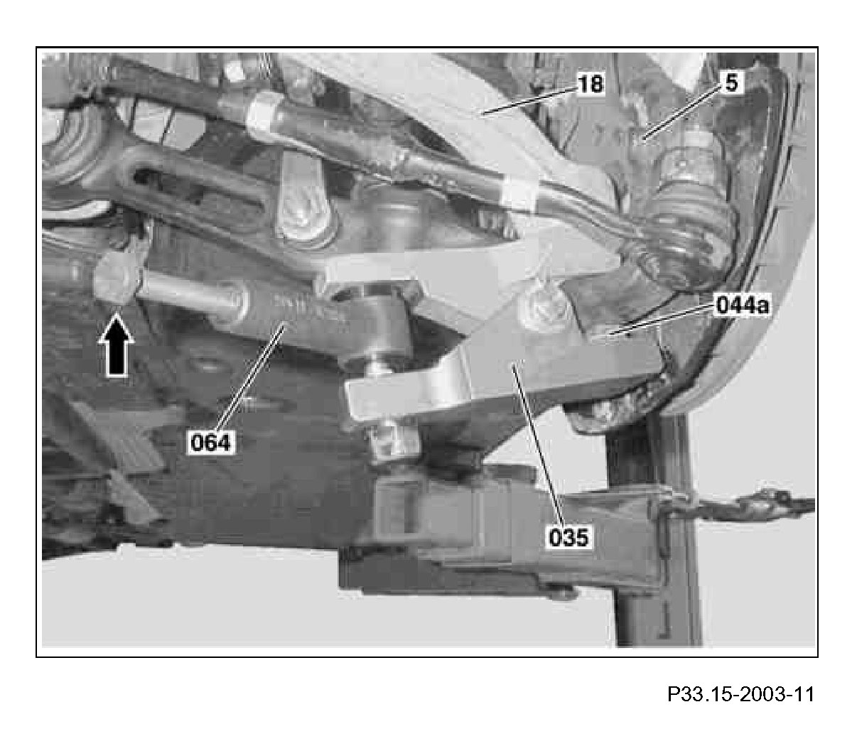 4 Use the press (064) and press out the radius rod (18) from the stub axle (5) by turning the spindle (arrow)