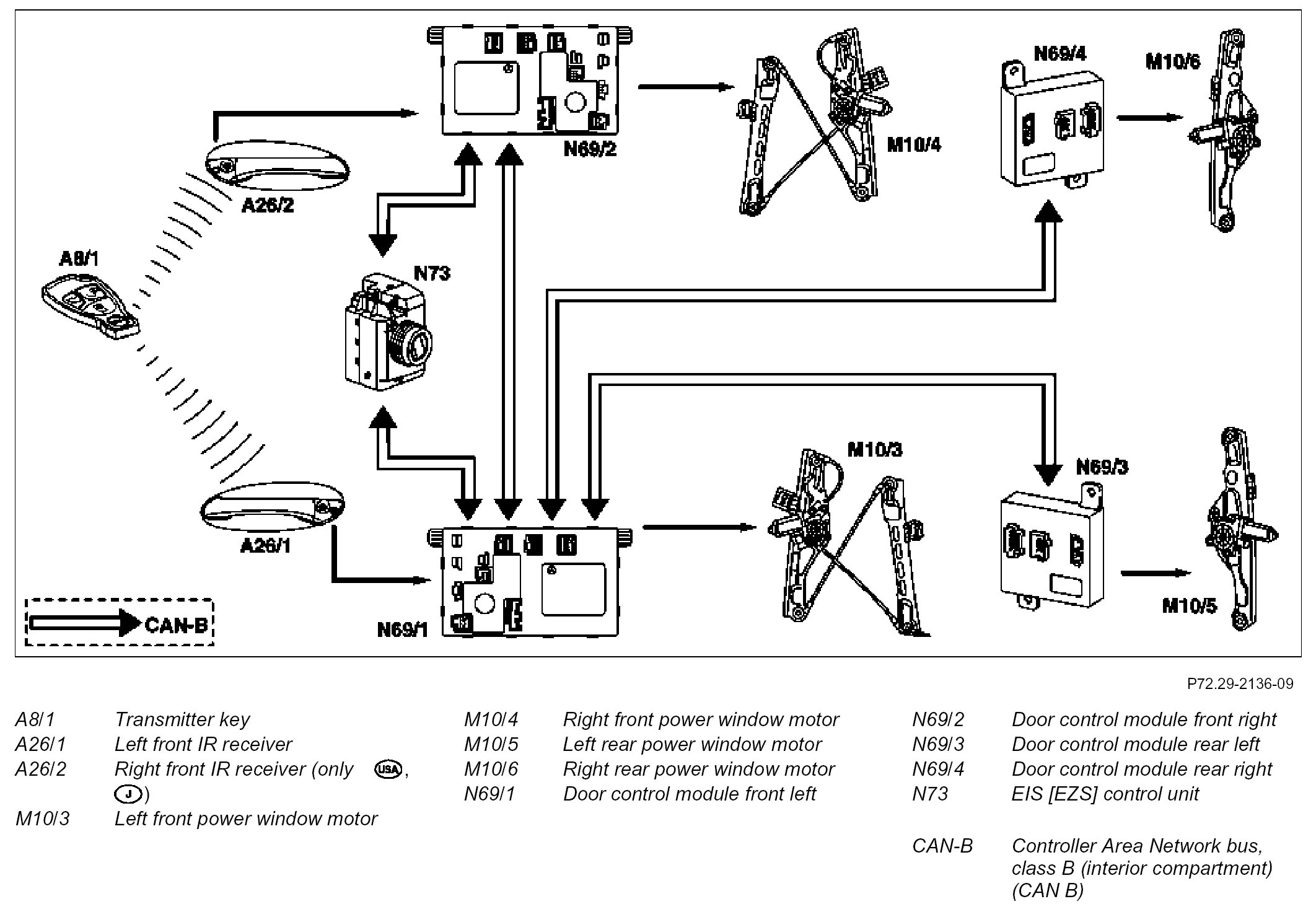 By actuating the lock button on the transmitter key (A8/1) the actuation request is received by the left front IR receiver (A26/1) and is transmitted to the left front door control unit (N69/1). It then actuates the left front power window motor (M10/3) in the "closing" direction and simultaneously relays the closing request to the right front door control unit (N69/2), left rear door control unit (N69/3) and right rear door control unit (N69/4).