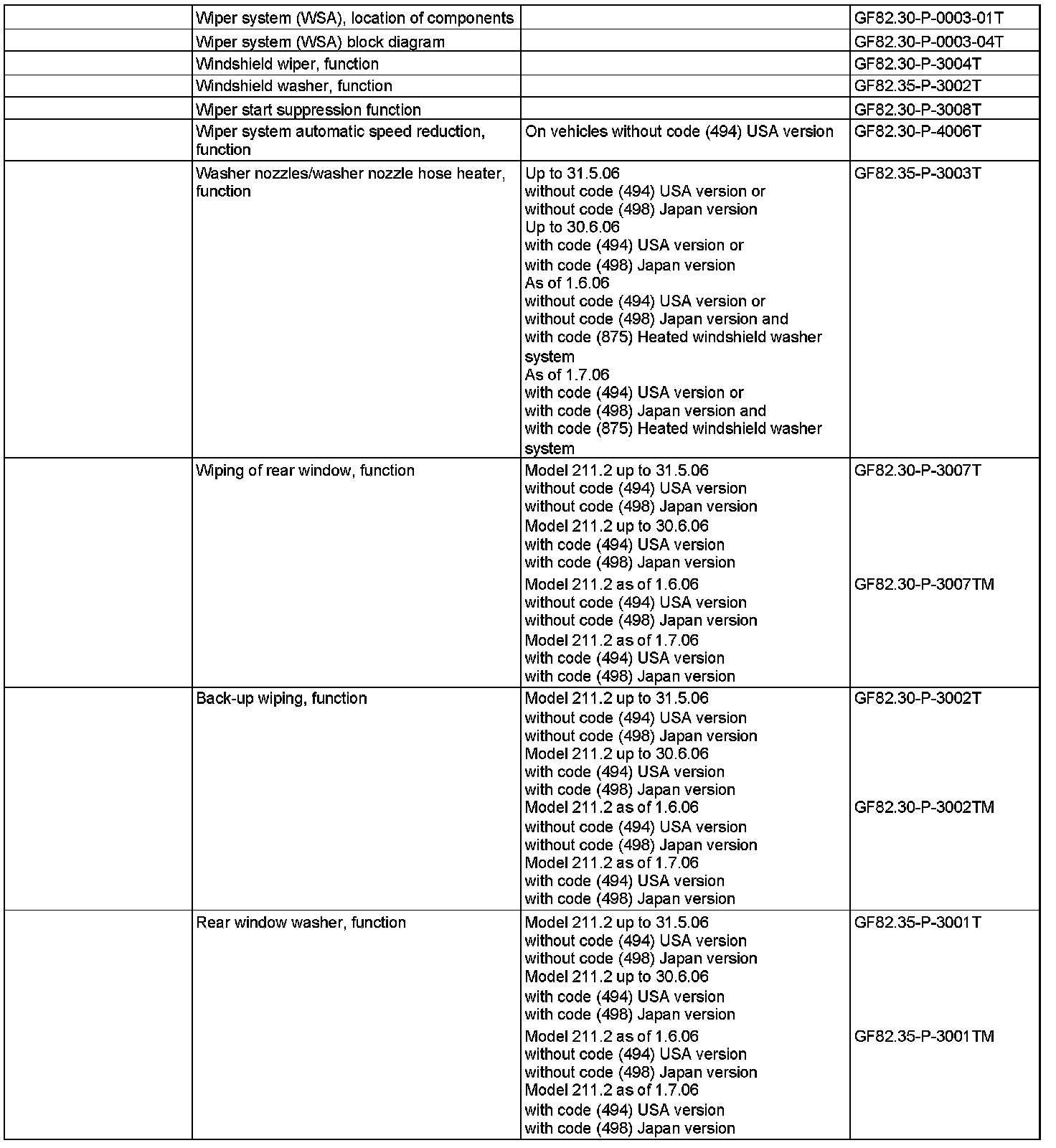 (up to 31.5.06 (not United States Of America or Japan) up to 30.6.06 (only United States Of America or Japan)or as of 1.7.06 (only standard, as of 1.6.06 (not United States Of America or Japan ) with code (875) Heated windshield washer system) or
