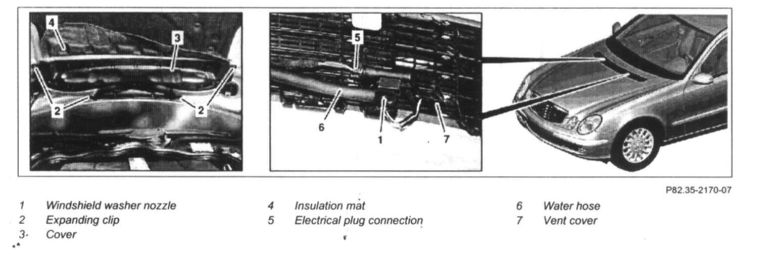 5 Unplug electrical connection (5) from windshield washer nozzle (1)