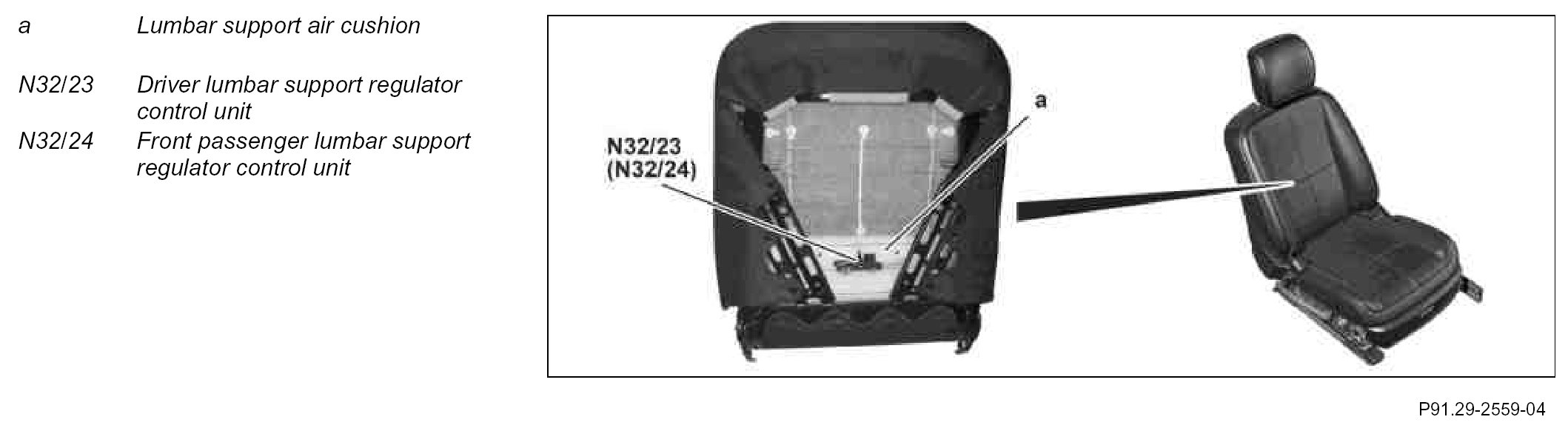 - Regulation of air cushion pressure in lumbar cushion of respective front seat controlled by left front seat control unit (N32/1) or by right front seat control unit (N32/2)