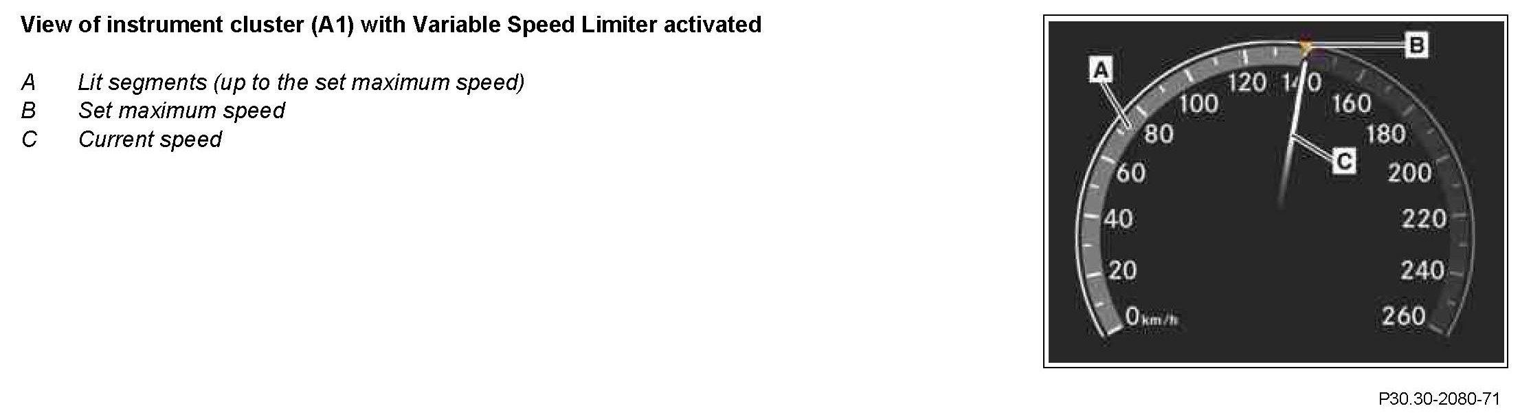 If the Variable Speed Limiter is activated at a speed of <30 km/h, the maximum speed is automatically set to 30 km/h.