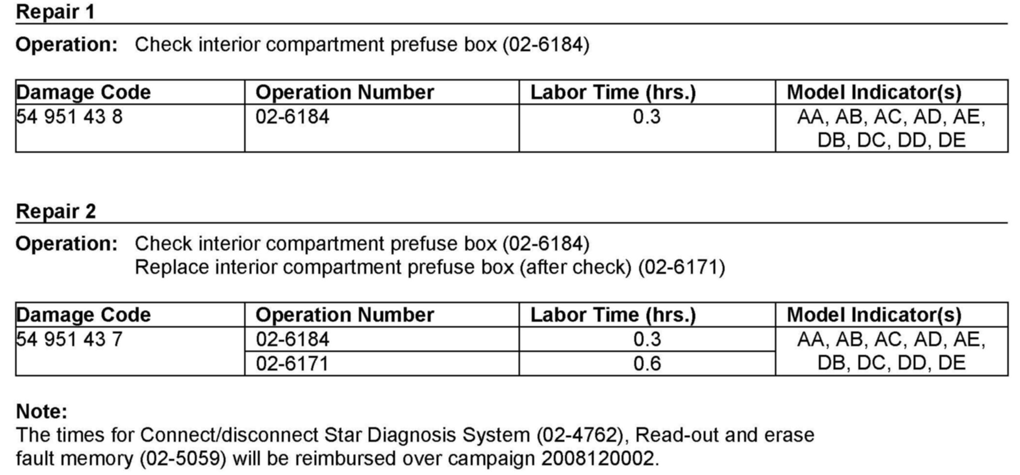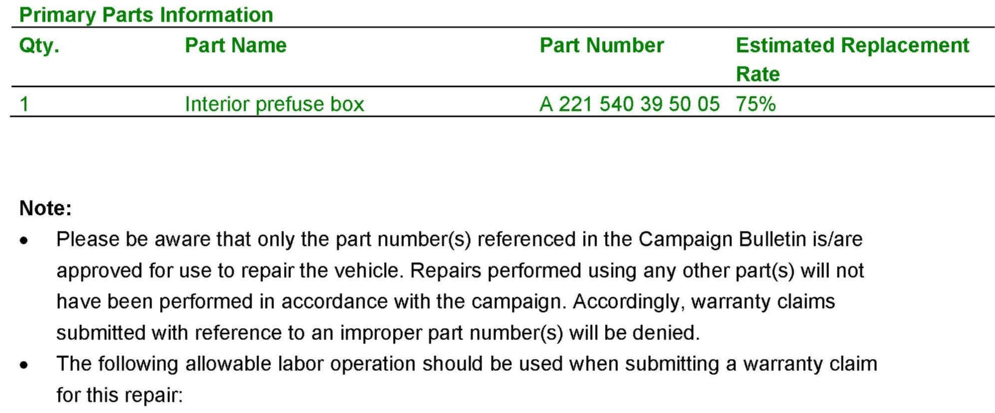 This Service Campaign has been initiated because Daimler AG has determined that due to supplier variations in the soldering process the prefuse box may not be within design tolerance. As a result, the starter relay may not function and a hard starting or no start condition may occur. The prefuse box will be checked for a "Q" level label and replaced, if necessary, at the next workshop visit
