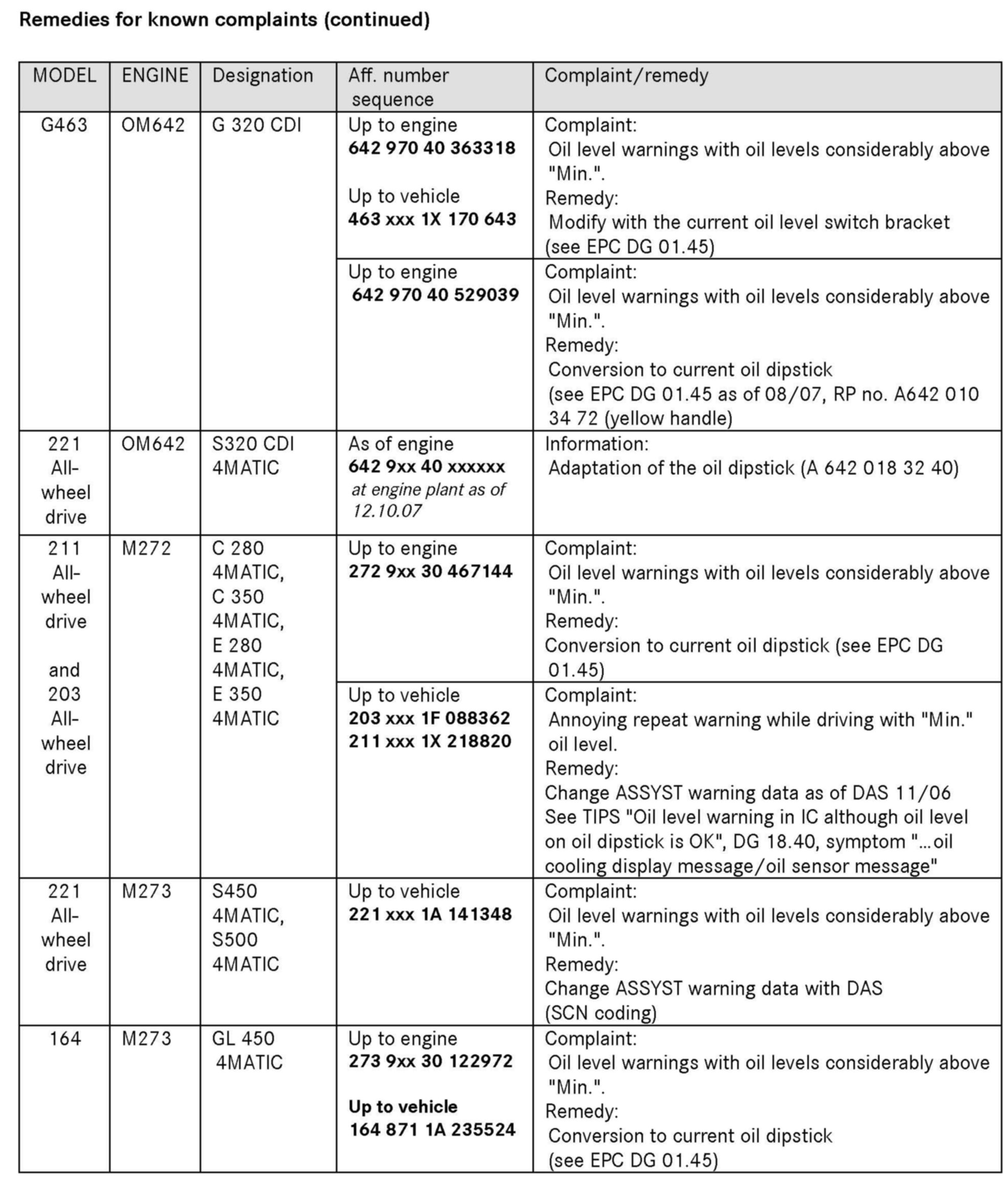 Remedies for known complaints in OM642, M272 and M273 engines