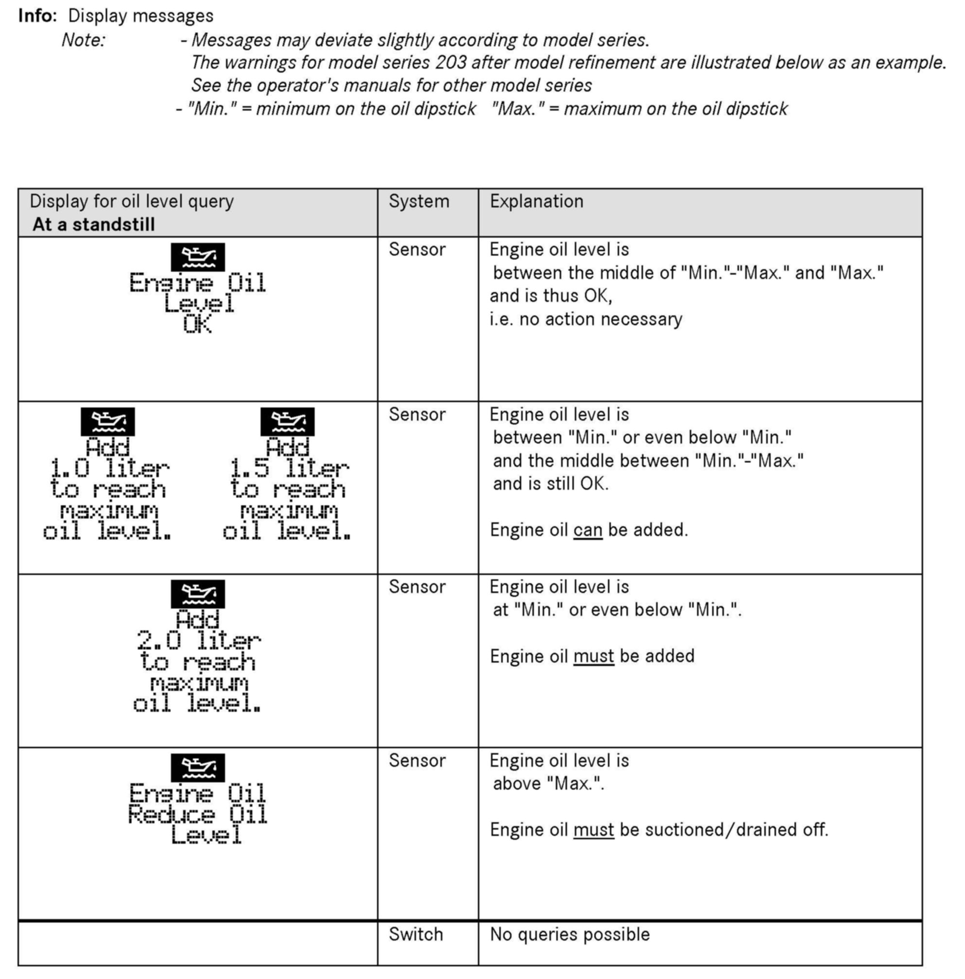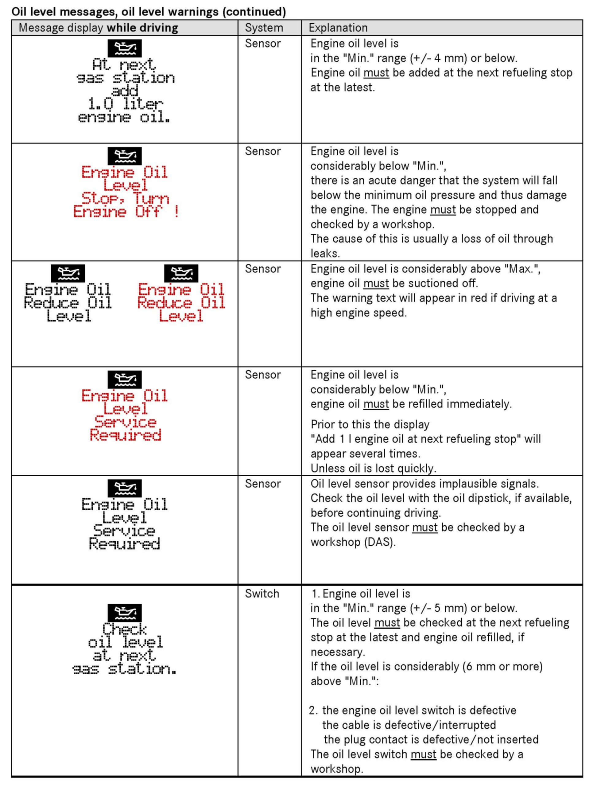 Oil level message, oil level warnings