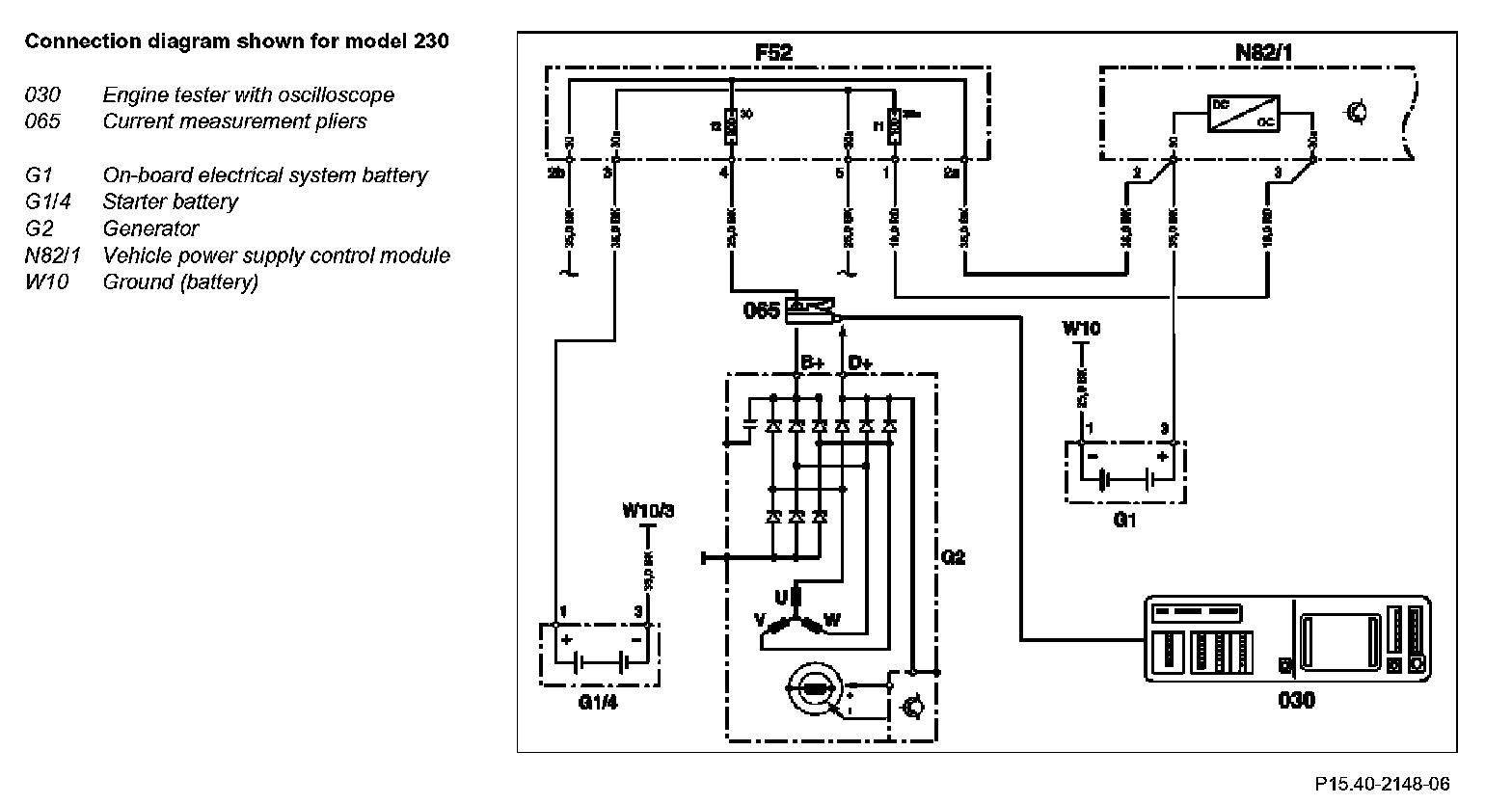 1 Connect up engine tester (030) with current clamp (065) according to connection diagram