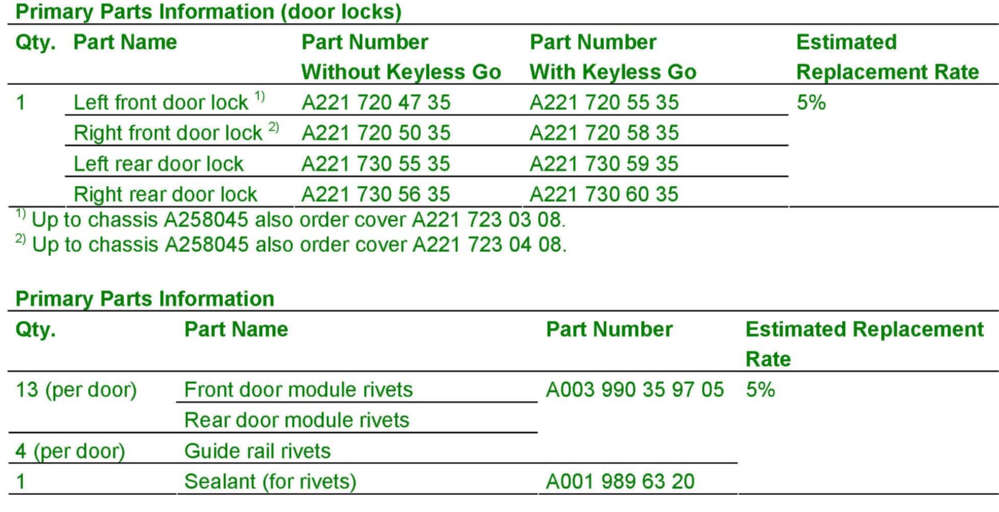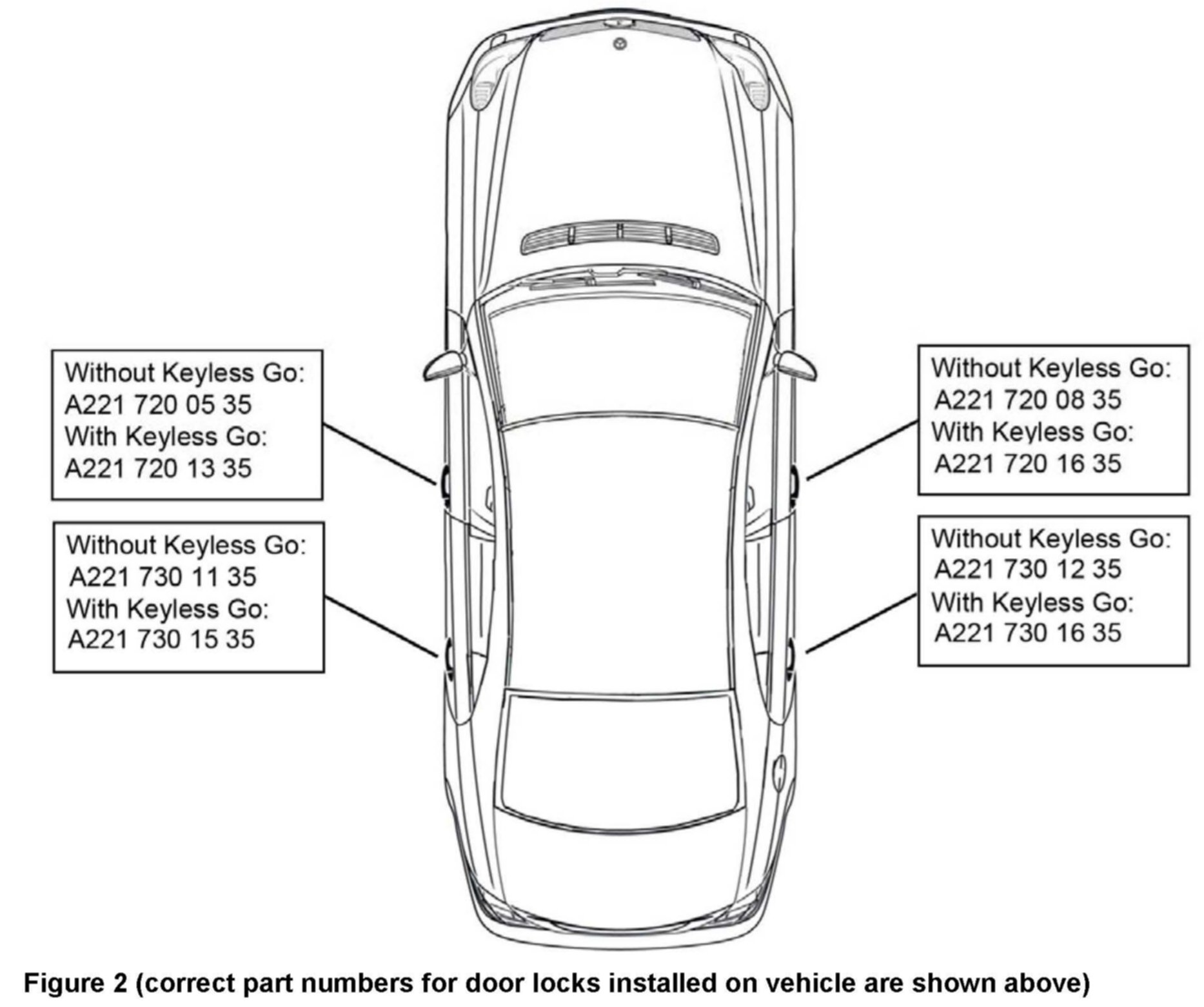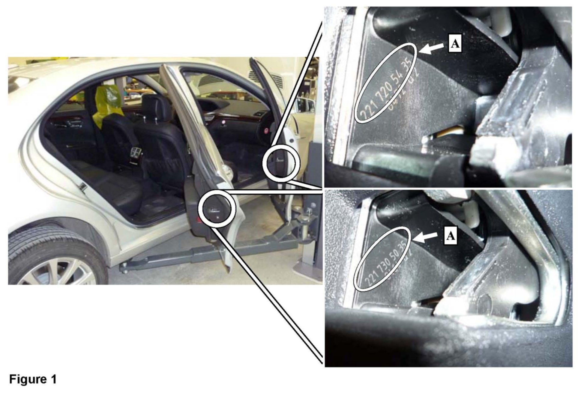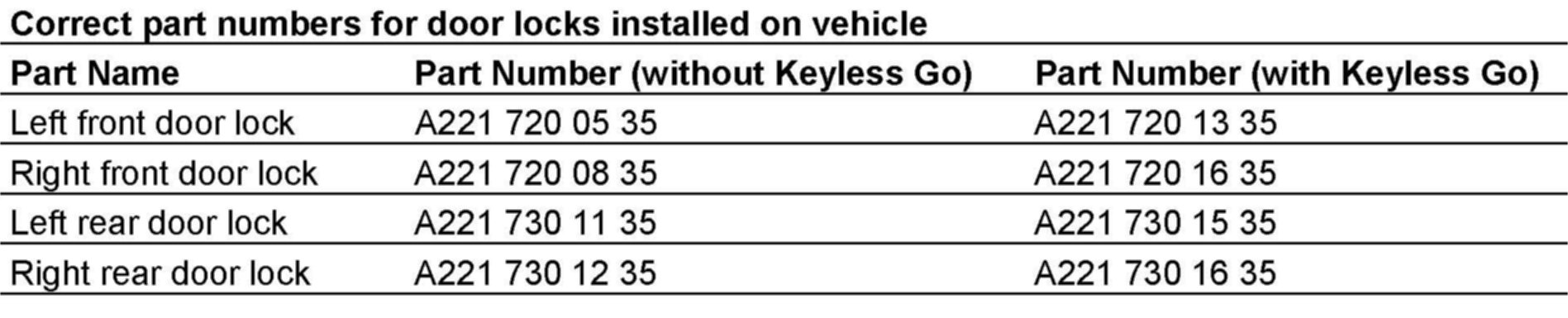 This Recall Campaign has been initiated because Daimler AG (DAG) has determined that a supplier may have incorrectly labeled the door locks used in certain S-Class vehicles. Due to this incorrect labeling on the door locks it is possible that the front and rear door locks in the vehicle were interchanged during production. The exchange of a front and a rear door lock would result in a front door lock that cannot be opened by merely pulling on the interior handle and a rear door lock that can be opened with a simple pull of the interior door handle even if locked. This situation could affect the safe exiting of a vehicle in the event of a crash or protection of children from inadvertent opening of the rear door.