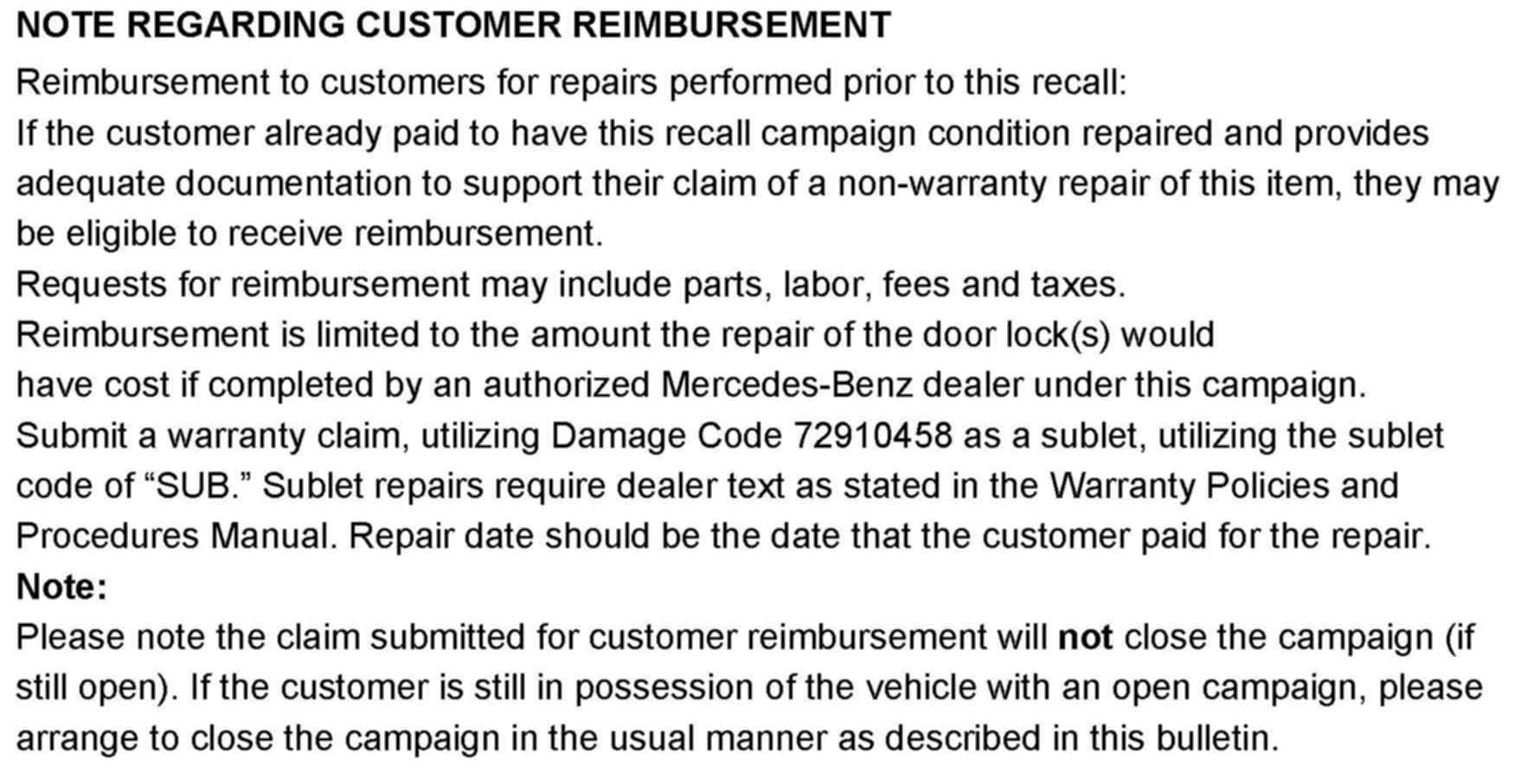 MBUSA will conduct a voluntary recall campaign for the subject vehicles described above. Dealers will check the part number on all door locks and replace, if necessary, any incorrectly installed door lock.