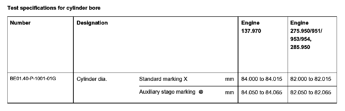 The cylinder bore diameter is specified in two tolerances. The two tolerances of the cylinder bore diameters are distinguished by the letters x and 0.