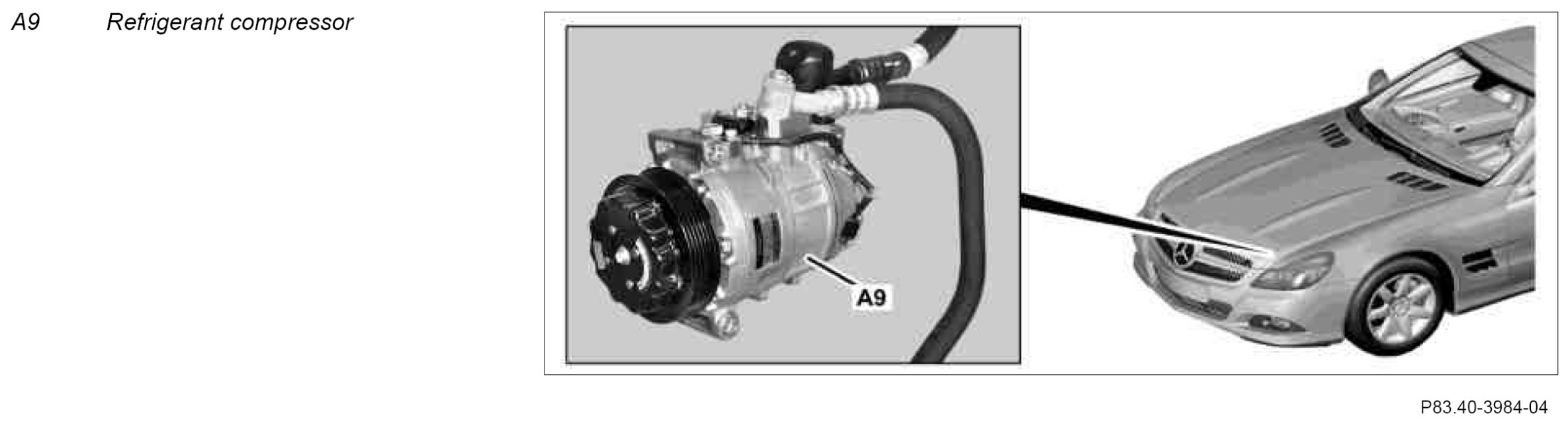 The refrigerant compressor is located at the left front of the engine.