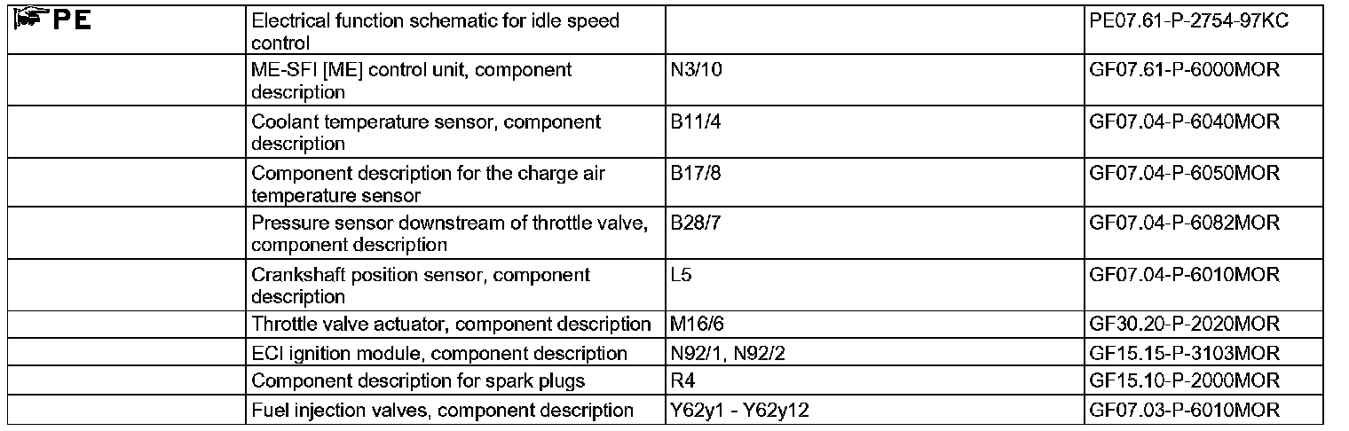 The ME-SFI control unit controls the idle speed through the throttle valve actuator (M16/6, ) and adapts the injection time of the injection valves (Y62) according to the variations in air mass.