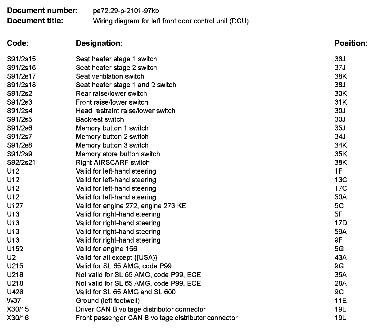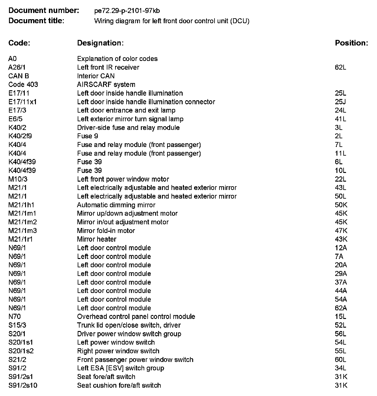 Wiring Diagram For Left Front Door Control Unit (DCU) PE72.29-P-2101KB