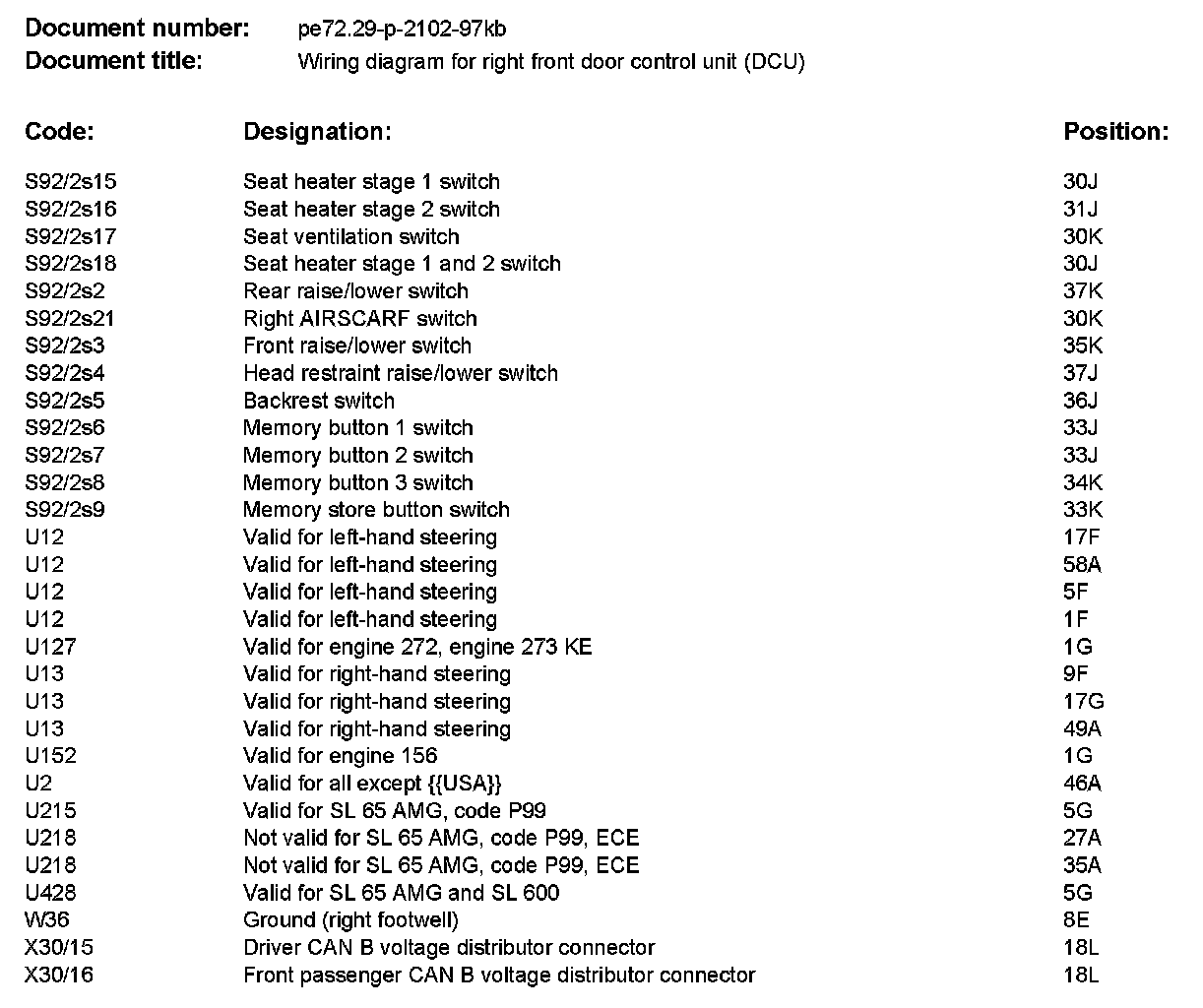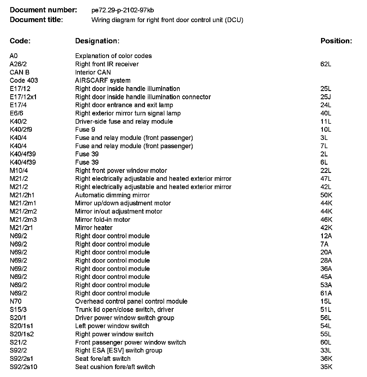 Wiring Diagram For Right Front Door Control Unit (DCU) PE72.29-P-2102KB