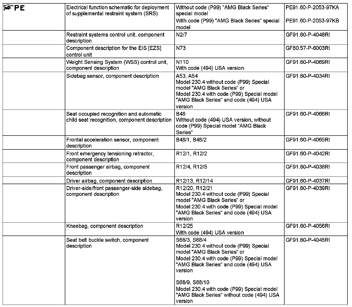 - The restraint systems control unit decides on the basis of the current occupancy of the front passenger seat (not with code (P99) Special model "AMG Black Series" without code (494) USA version) whether to trigger the front passenger sidebag unit.