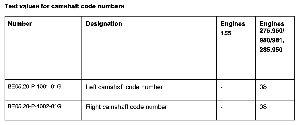 Test values for camshaft code numbers: