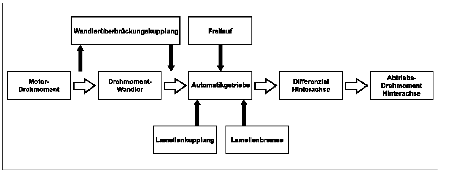 The term "power flow" refers to the transmission paths of driving power and engine torques. The engine torques are transmitted to the drive wheels via the mechanical-hydraulic connection between the engine, torque converter, the downstream automatic transmission and rear axle differential.