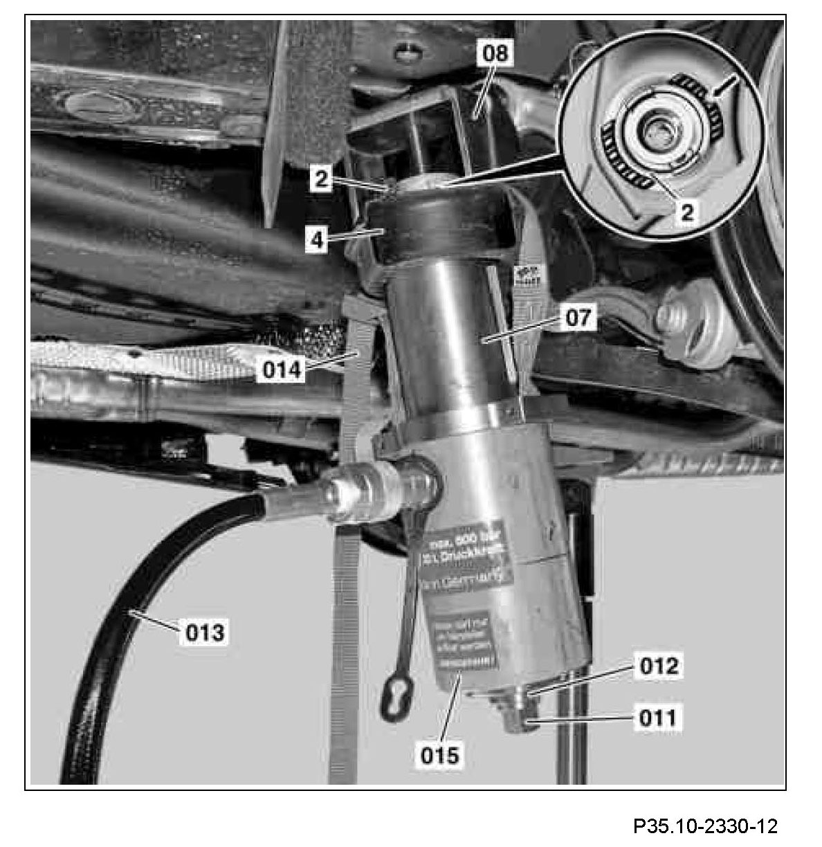 3 Connect hand pump by means of hydraulic hose (013) on hollow cylinder (015).