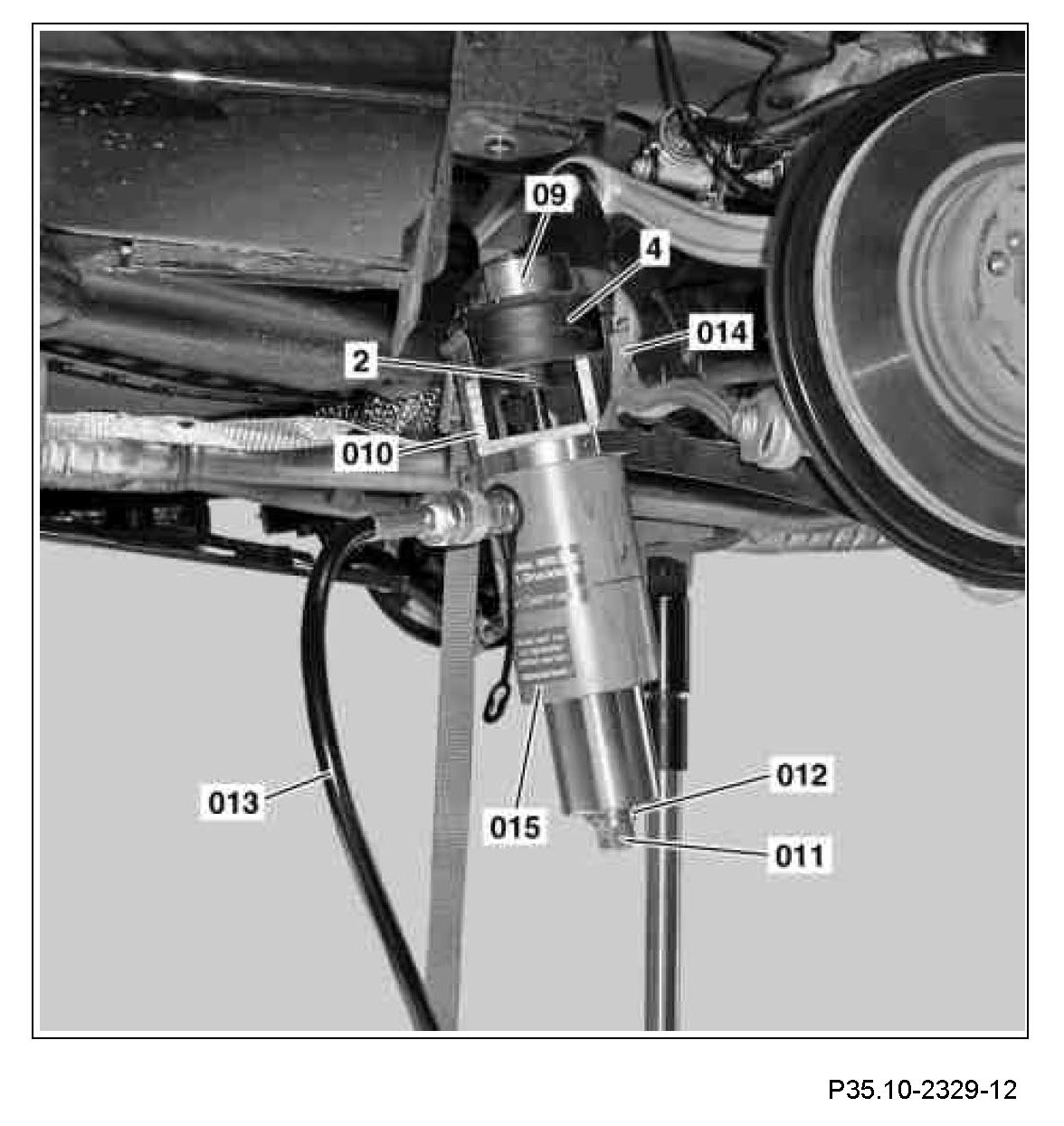 6 Attach thrust piece (09), counterholder (010), spindle (011) and sleeve (012) with hollow cylinder (015) and retaining belt (014) to rubber mount (2).