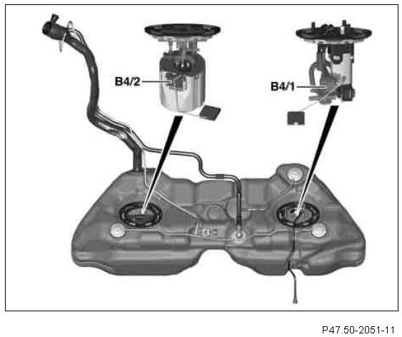Voltage signals from both fuel level sensors are transmitted separately to the rear SAM control unit with fuse and relay module (N10/2) which processes the signals accordingly and transmits them to the instrument cluster (A1) via the interior CAN (CAN B).