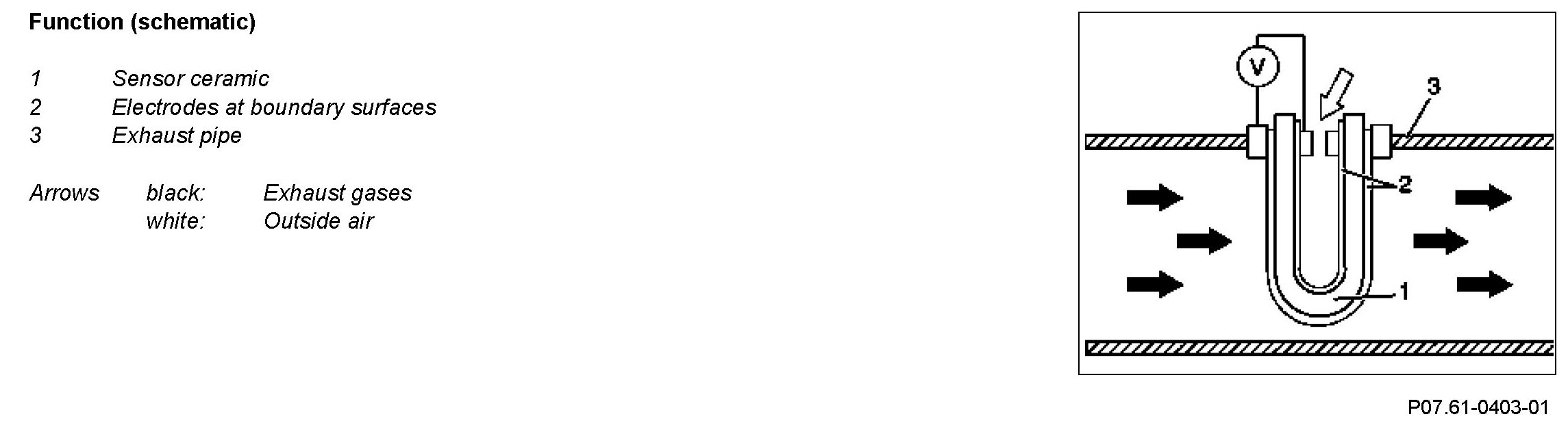 The sensor ceramic is conductive for oxygen ions from approx. 300 °C. If the oxygen concentration on both sides of the sensor ceramic differs, the signal voltage is produced at the boundary surfaces as a result of the particular properties of the sensor ceramic (Nernst concentration cell). This is a measure for the residual oxygen content in the exhaust.