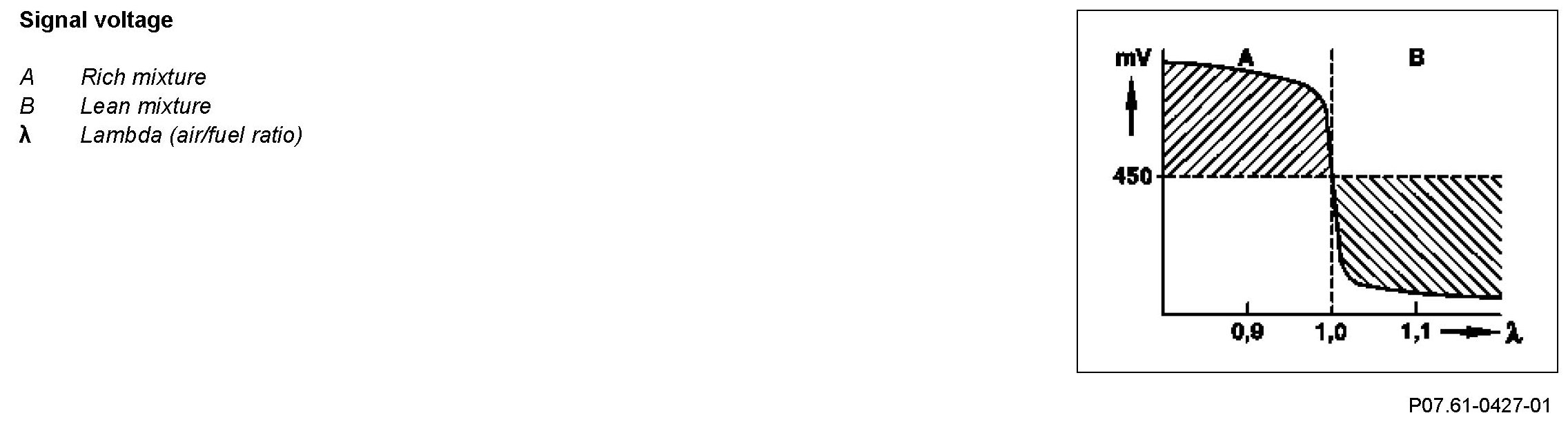 The signal voltage has a steep voltage jump at the transition from a lean to a rich mixture ( Lamda=1). This property is utilized for lambda control.