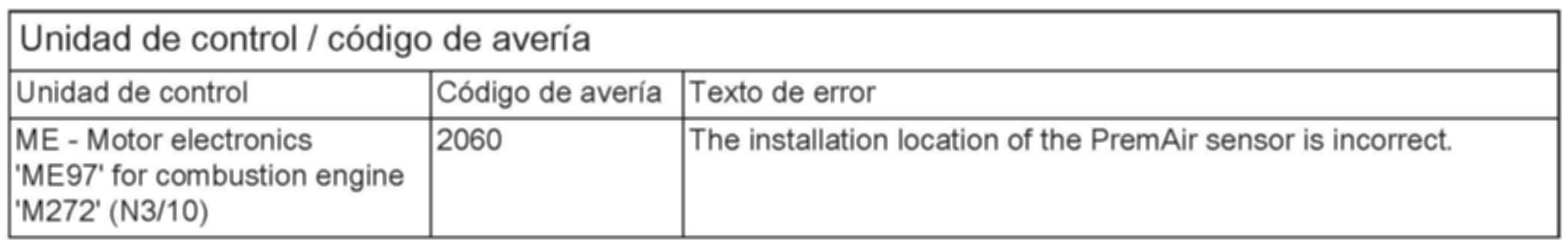 Models 204 and 212: Fault code 2060 (fault text: The PremAir sensor has a malfunction) in fault memory of gasoline engine control unit.