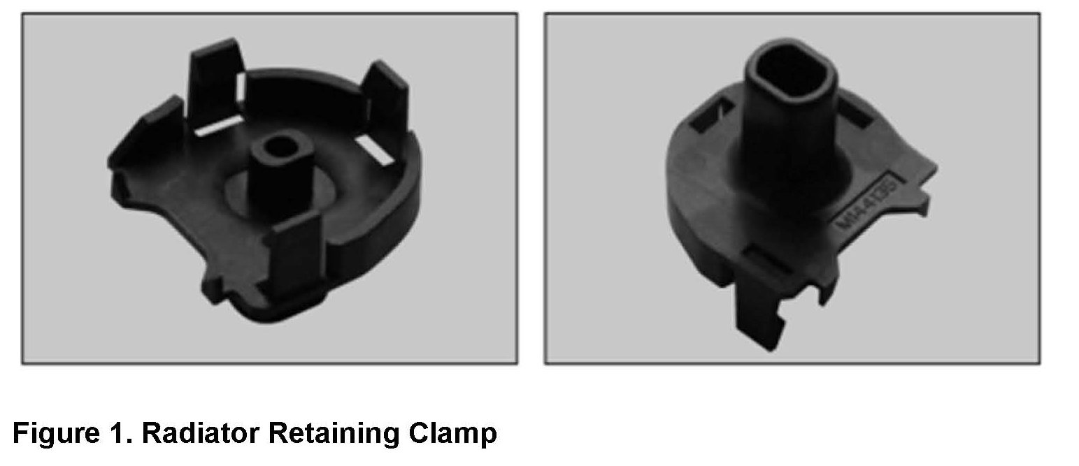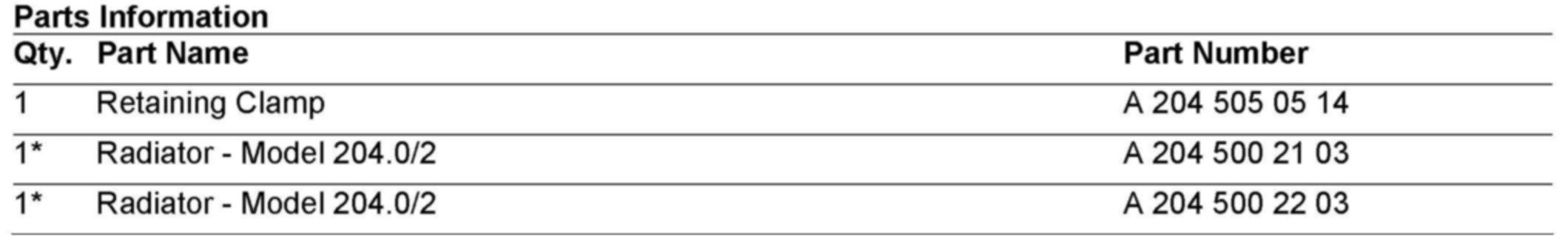 In the event of a broken off or damaged radiator mounting bracket at the bottom, the retaining clamp A 204 504 05 14, can be used to repair the radiator.