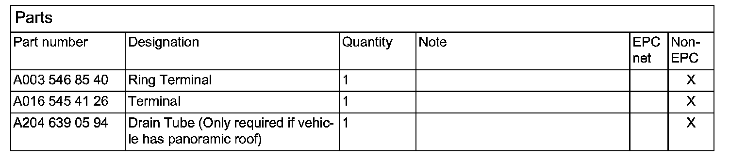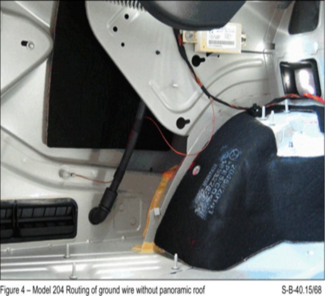 On vehicles with panoramic roof (Code 413), there is no drain tube installed. remove the rubber plug and install drain tube, part no. A204 639 05 94, into hole. cut tube length as required securing the ground wire as shown in Figure 4.