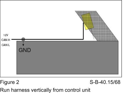 4. Re-route the harness as shown in Figure 1 and 2 with the harness being run vertically from the TPMS control unit down to the body of the vehicle.