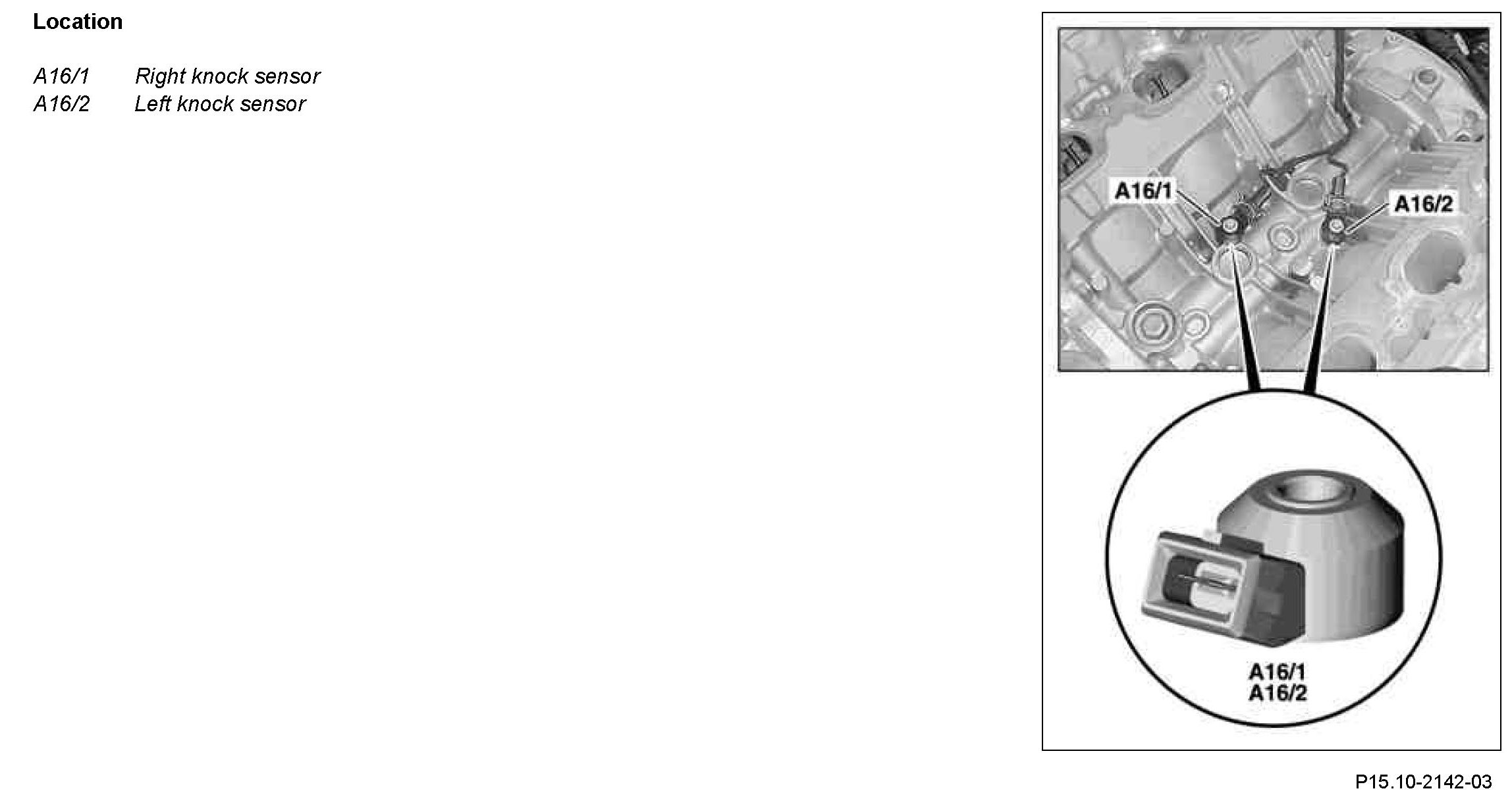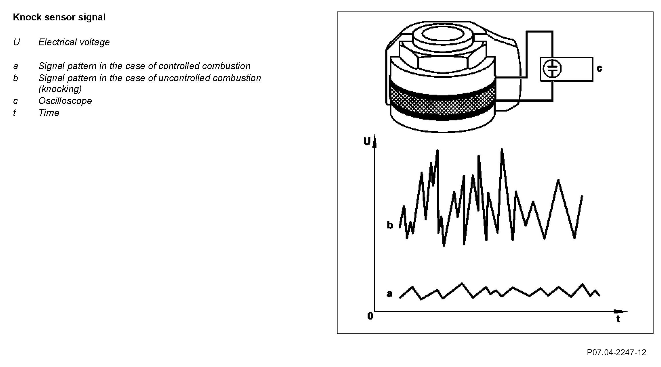 Vibrations on the crankcase are converted by the internally-mounted piezo crystals of the Knock sensors into electrical DC voltage signals (from 0.13 to 4.7 V).