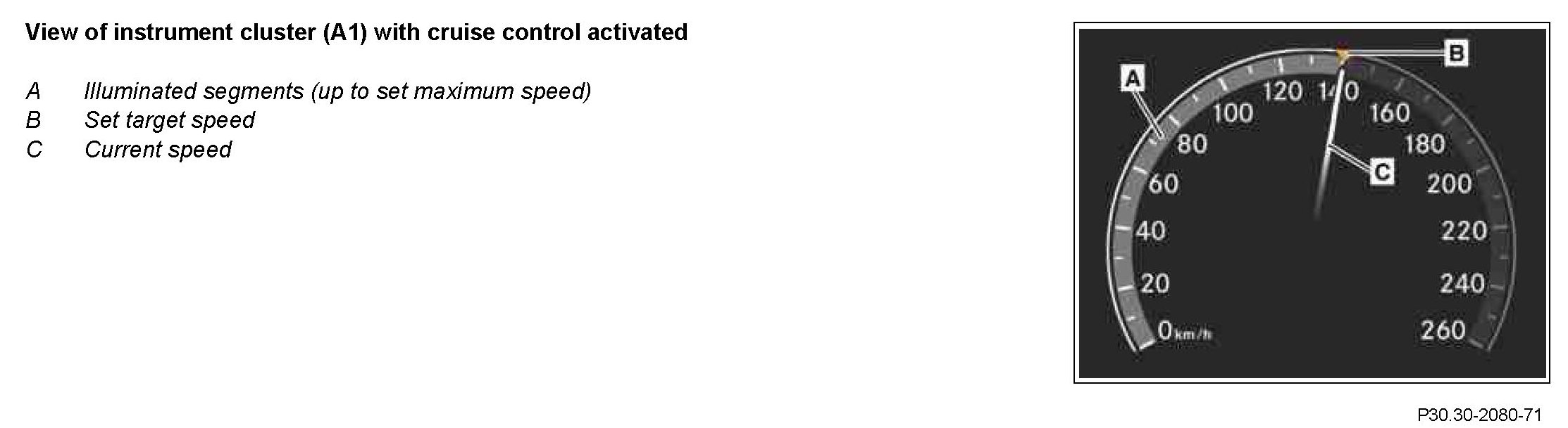 If the cruise control is activated, the segments around the speedometer rim are illuminated from the start of the scale up to the set maximum speed. The set target speed is marked by an orange triangle.