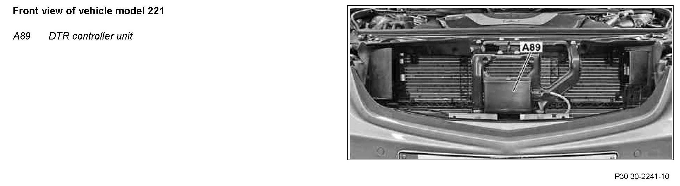 The DTR control unit (A89n1) integrated in the DTR controller unit actuates the DTR radar sensor (long range sensor) and evaluates the target data. The DTR controller unit sends the long range radar data via the dynamics CAN (CAN H) to the radar sensors control unit (for vehicle longitudinal control by Distronic PLUS).