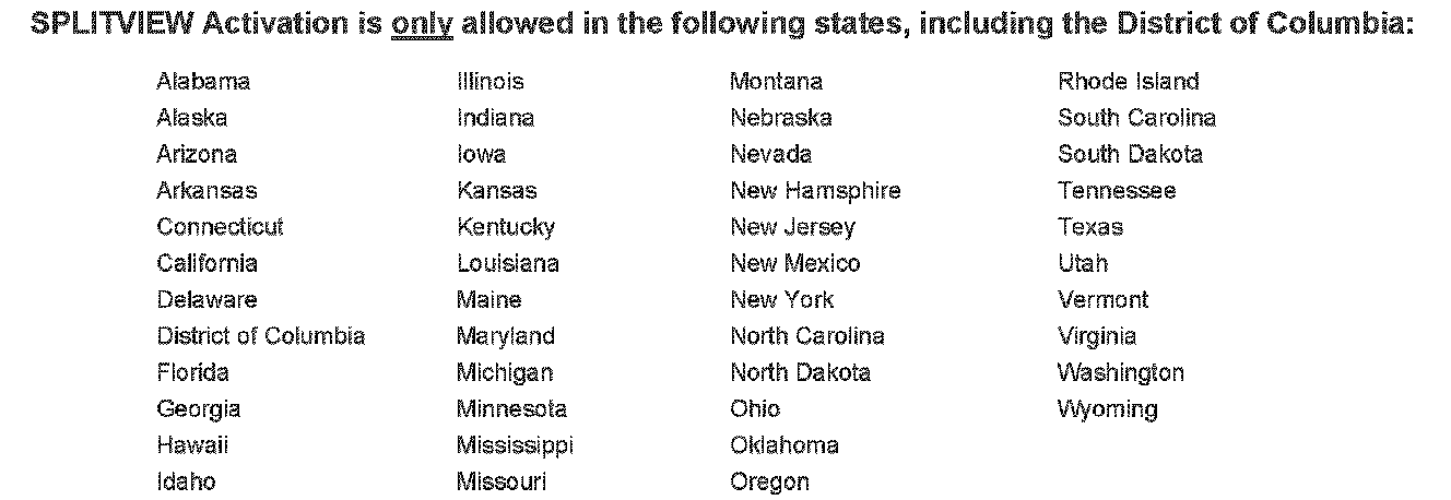 Due to various state laws, SPLITVIEW is currently only allowed in certain states. As of January 1, 2012, the state of Illinois now allows SPLITVIEW.